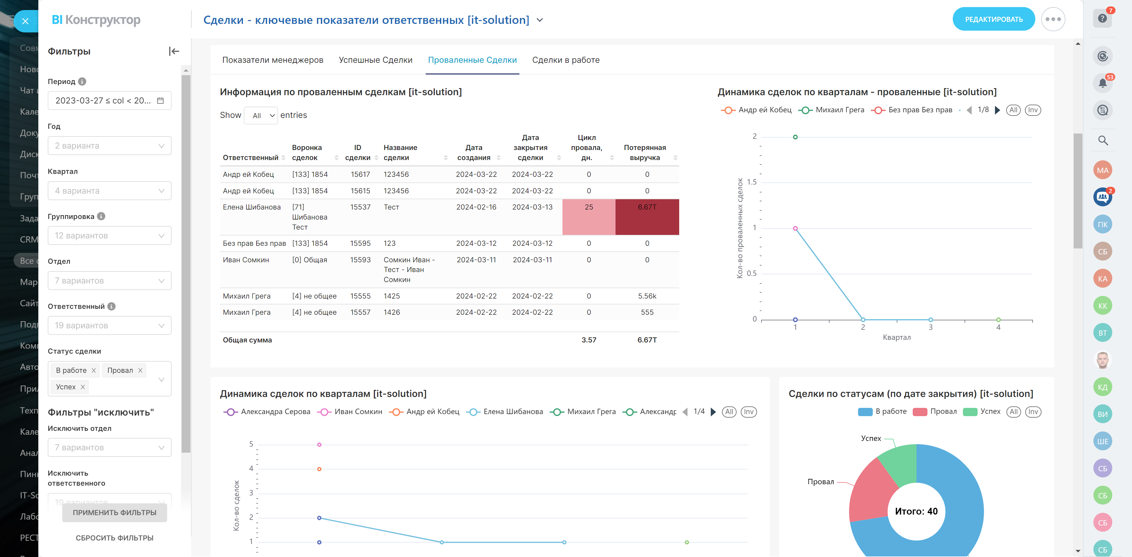В разделе отображаются проваленные сделки каждого менеджера, длительность работы с каждой из них, а также динамика по кварталам.