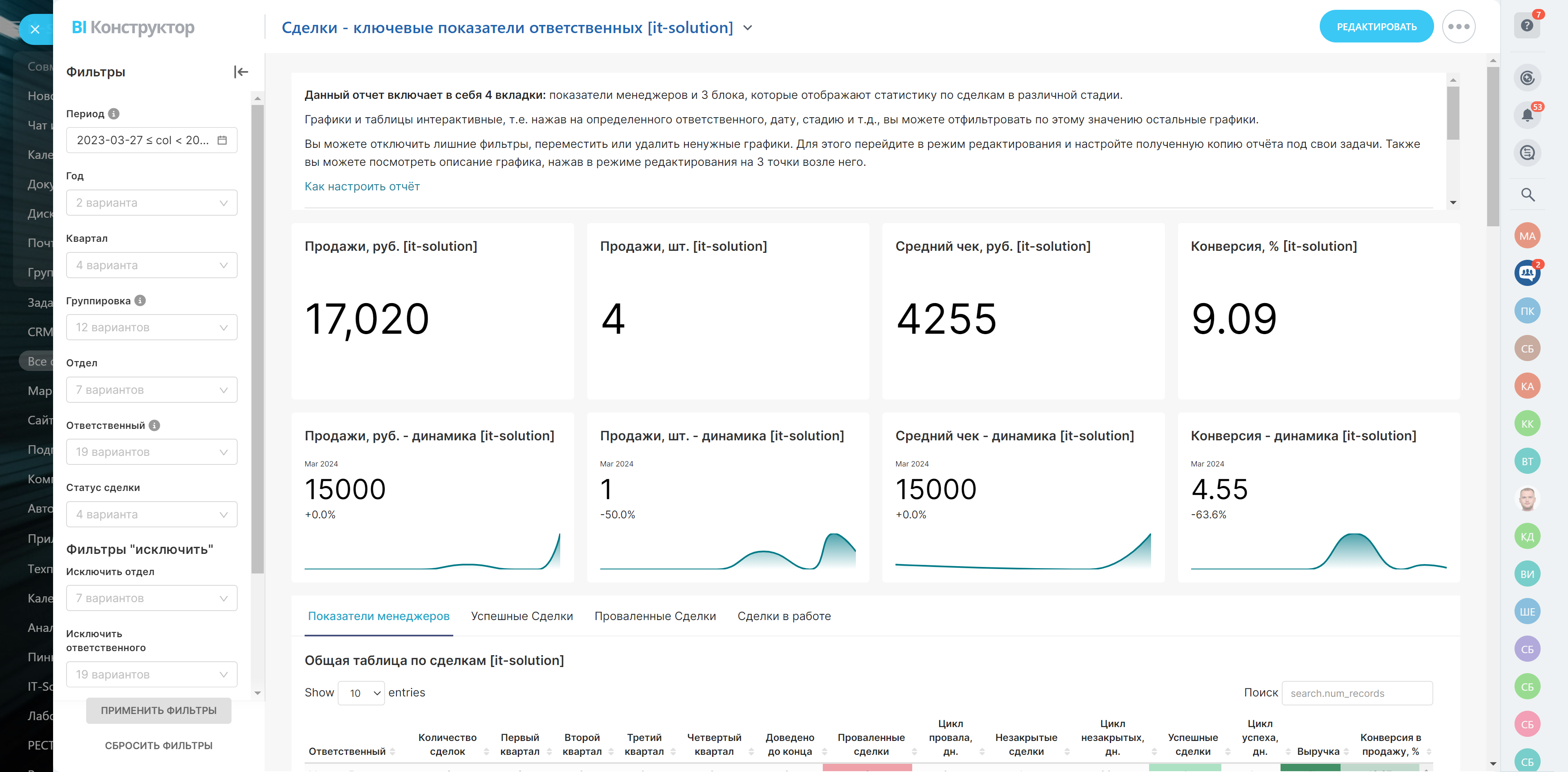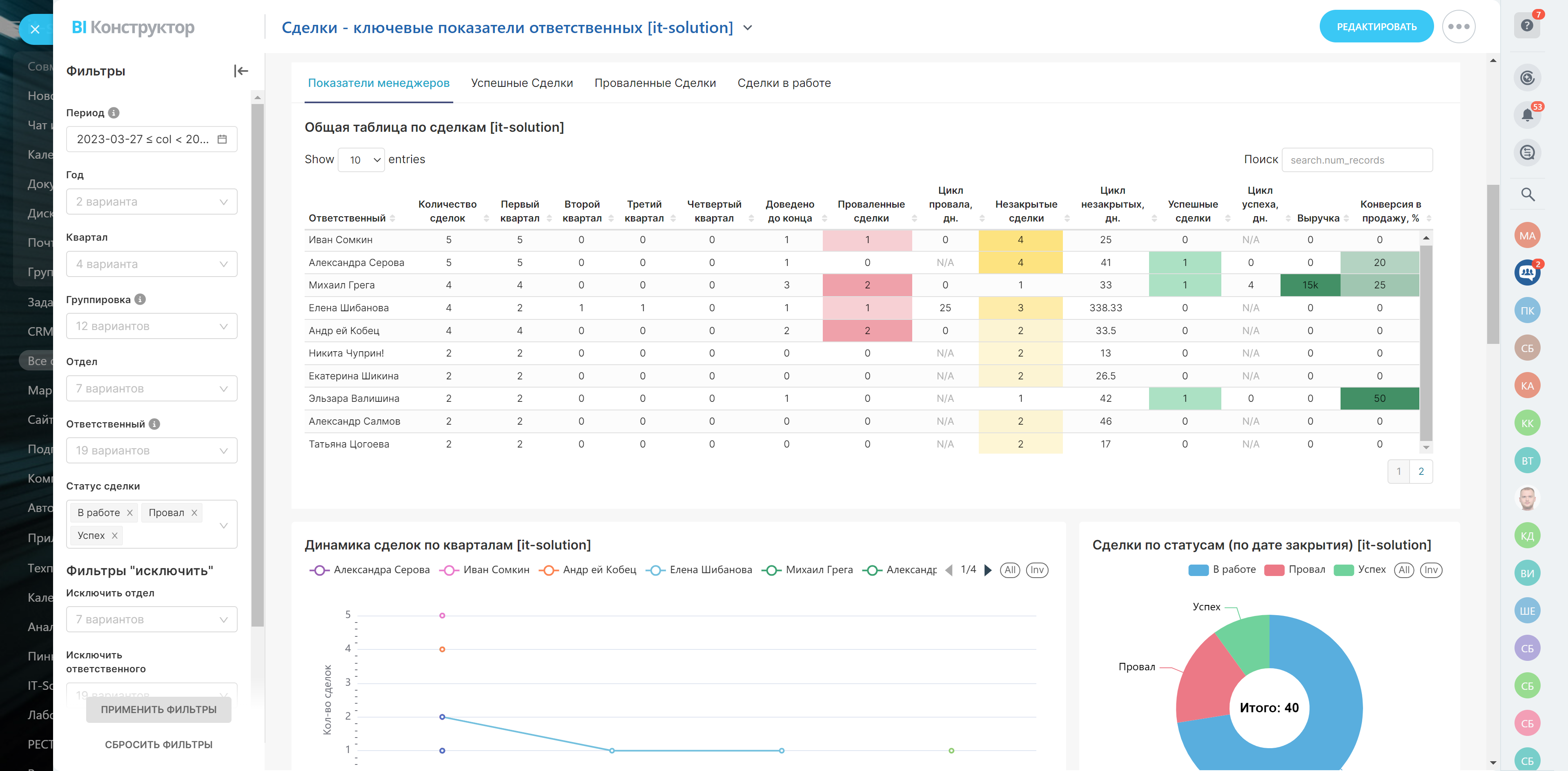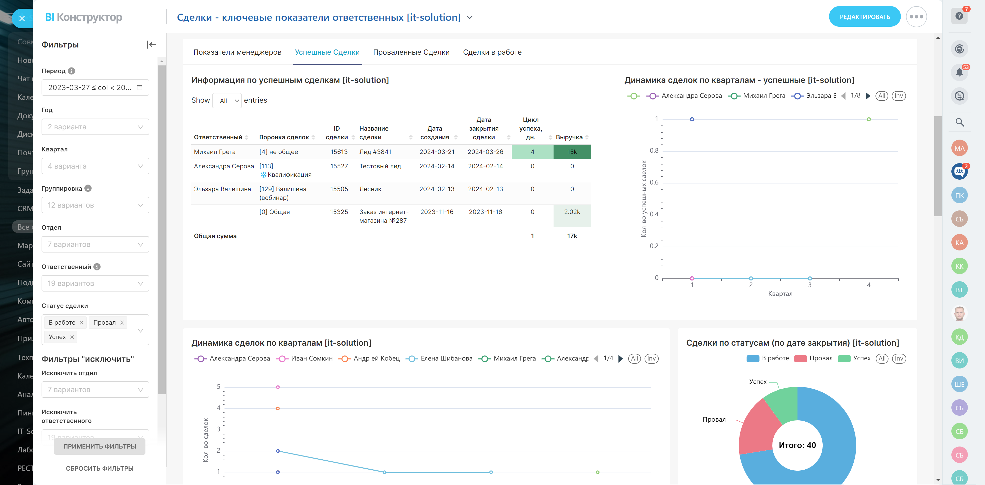 - Количество сделок по кварталам, успешные, проваленные, незакрытые сделки и продолжительность работы с ними, выручка и конверсия в продажу по каждому ответственному.