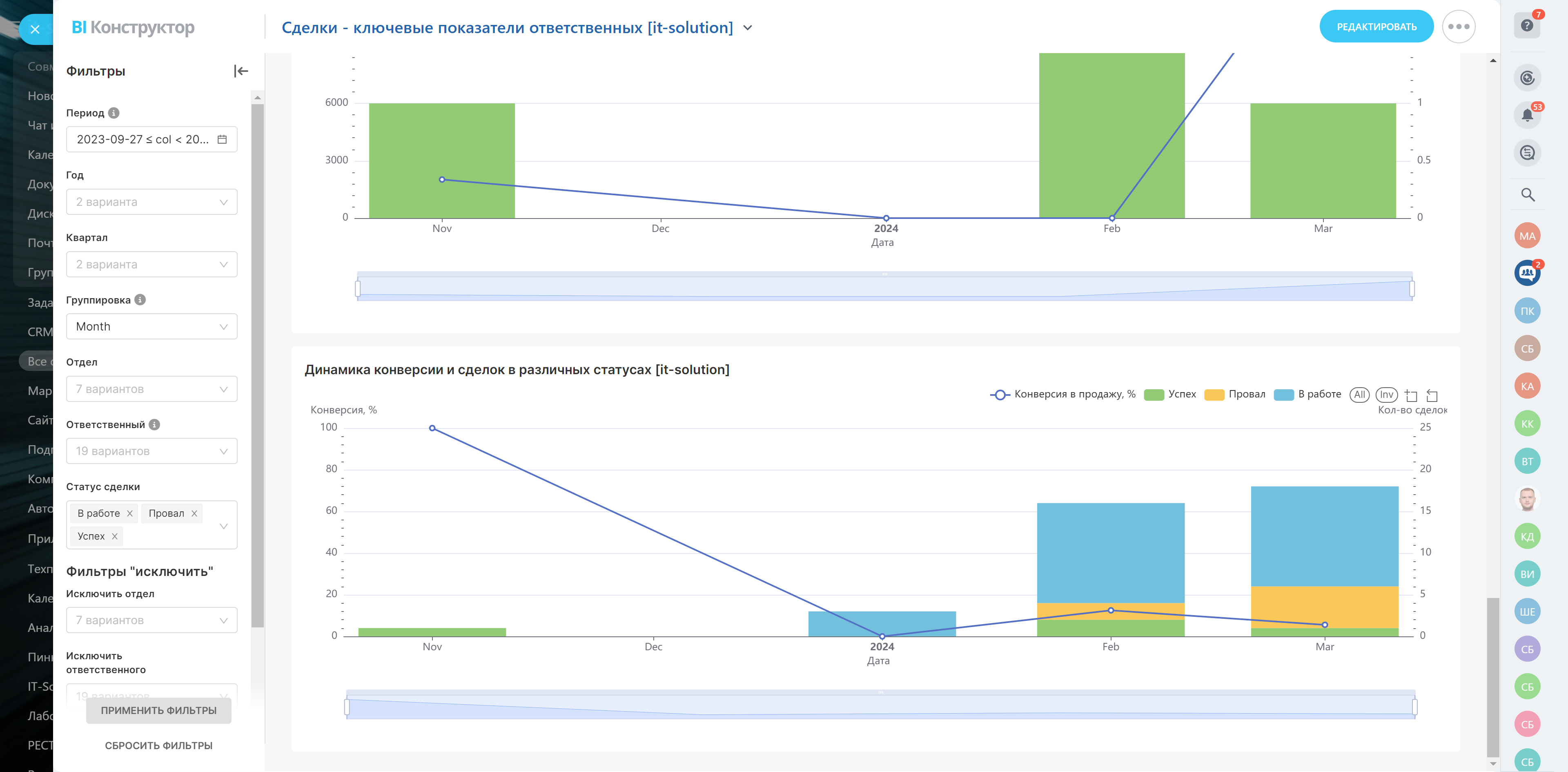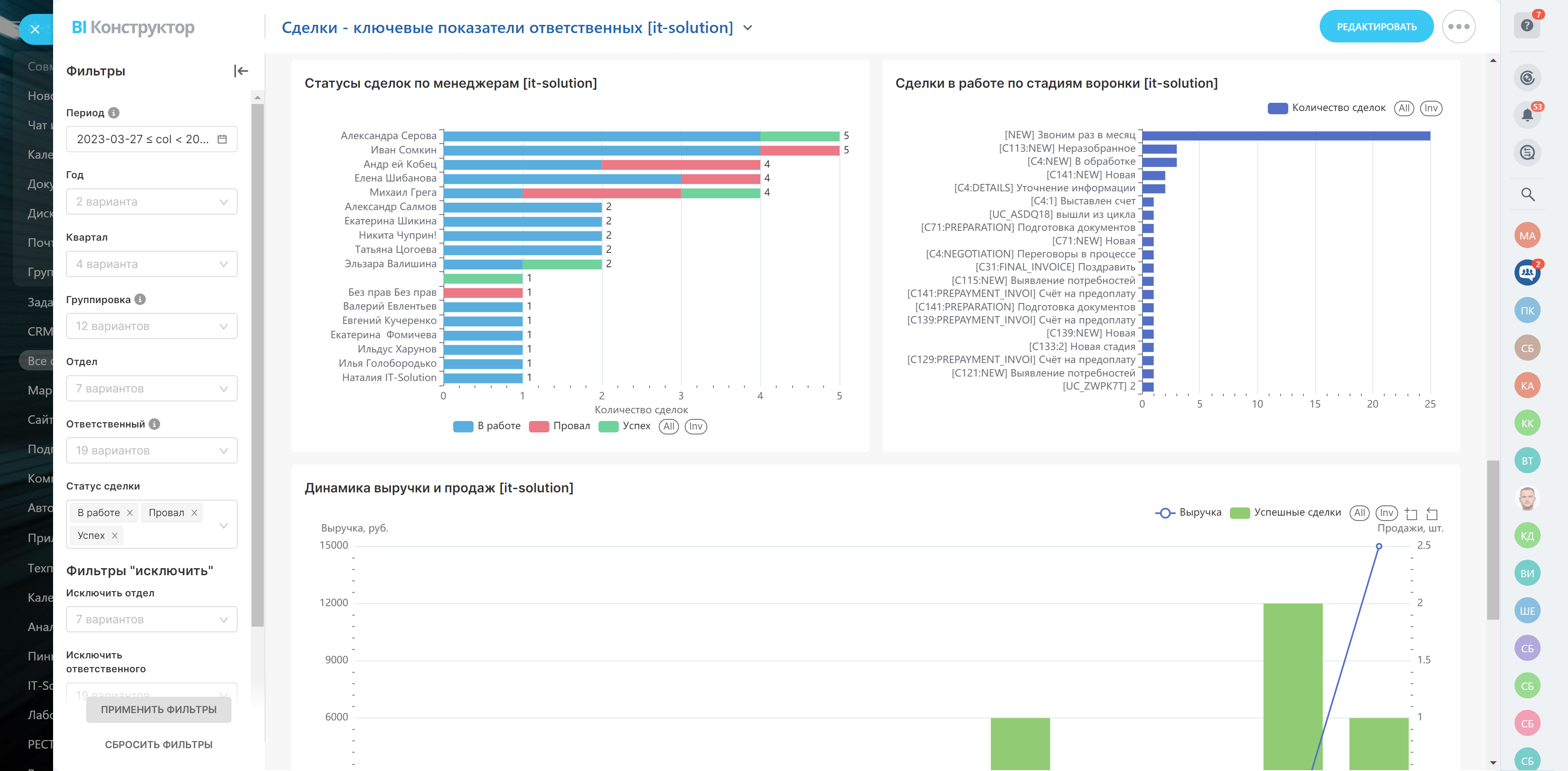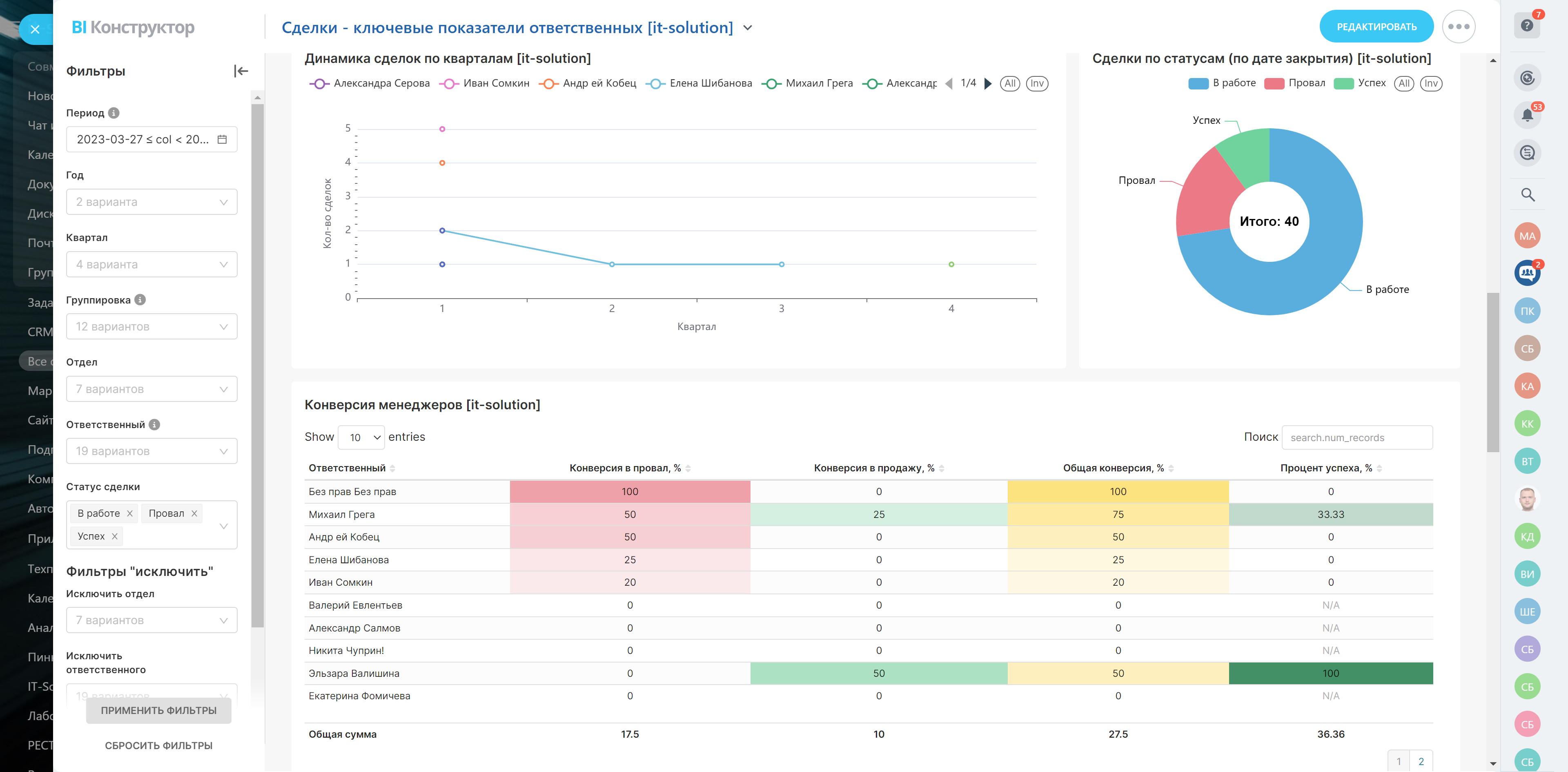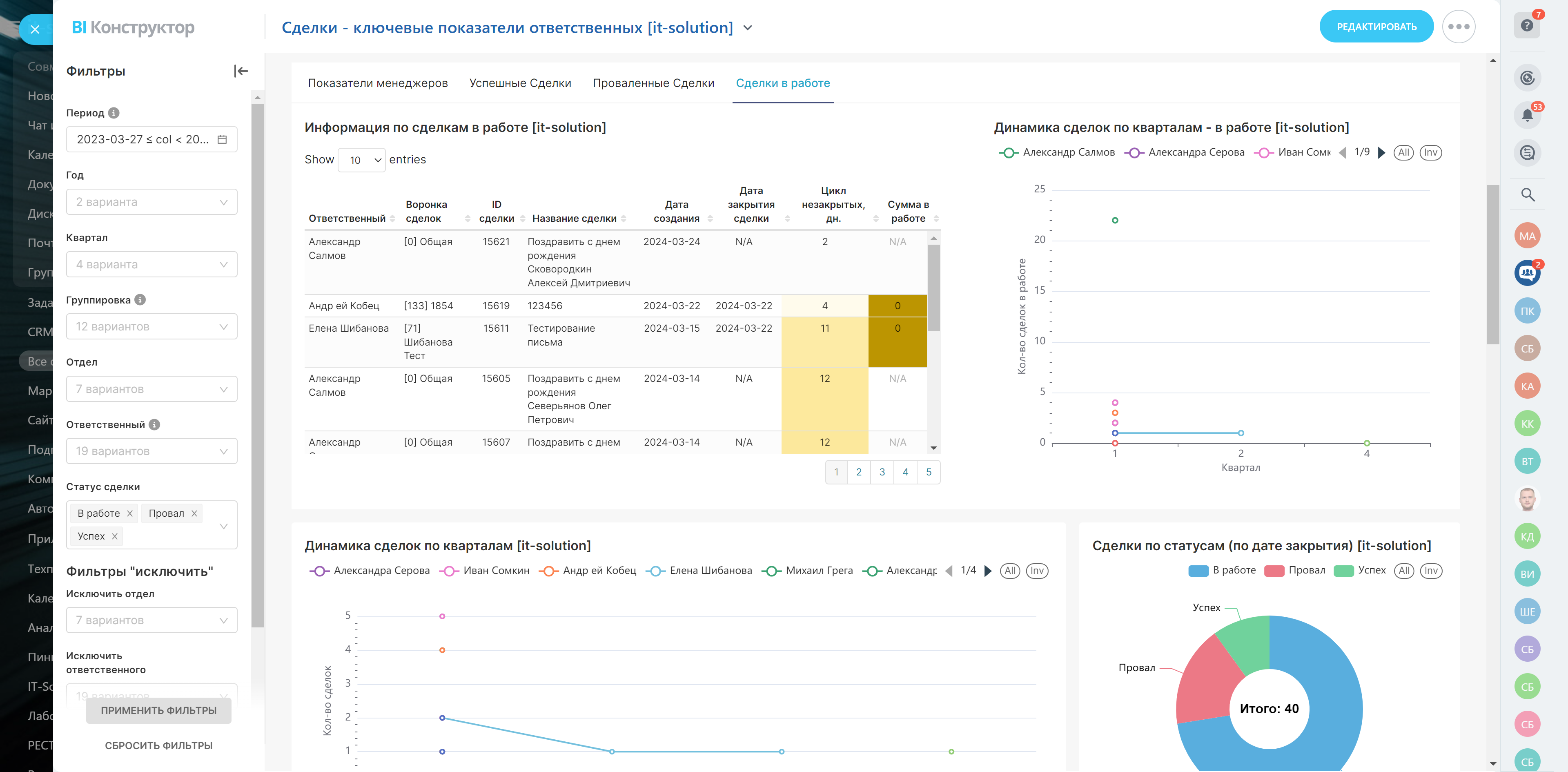 - Количество сделок по кварталам, успешные, проваленные, незакрытые сделки и продолжительность работы с ними, выручка и конверсия в продажу по каждому ответственному.