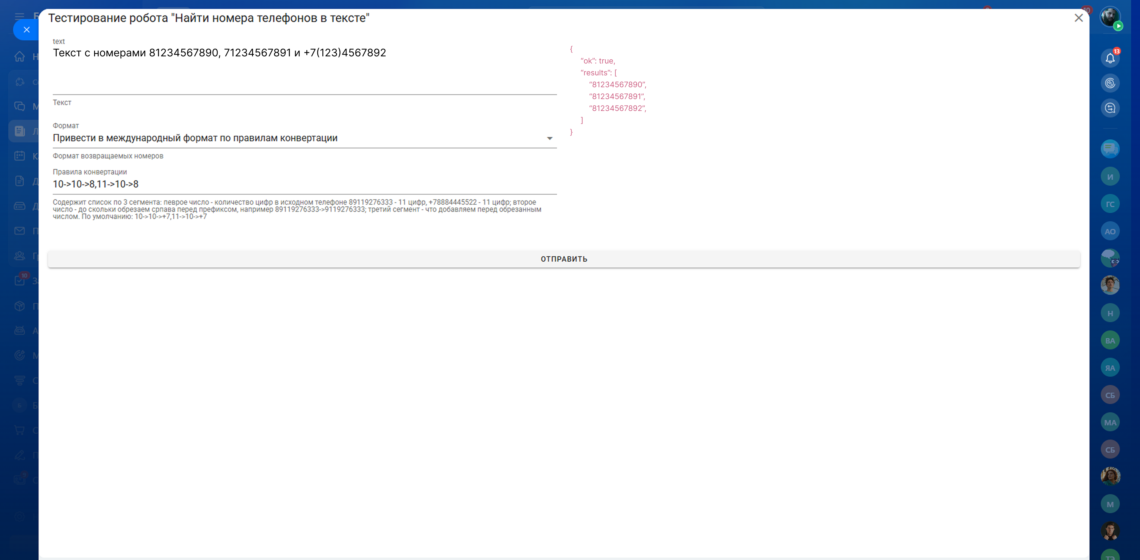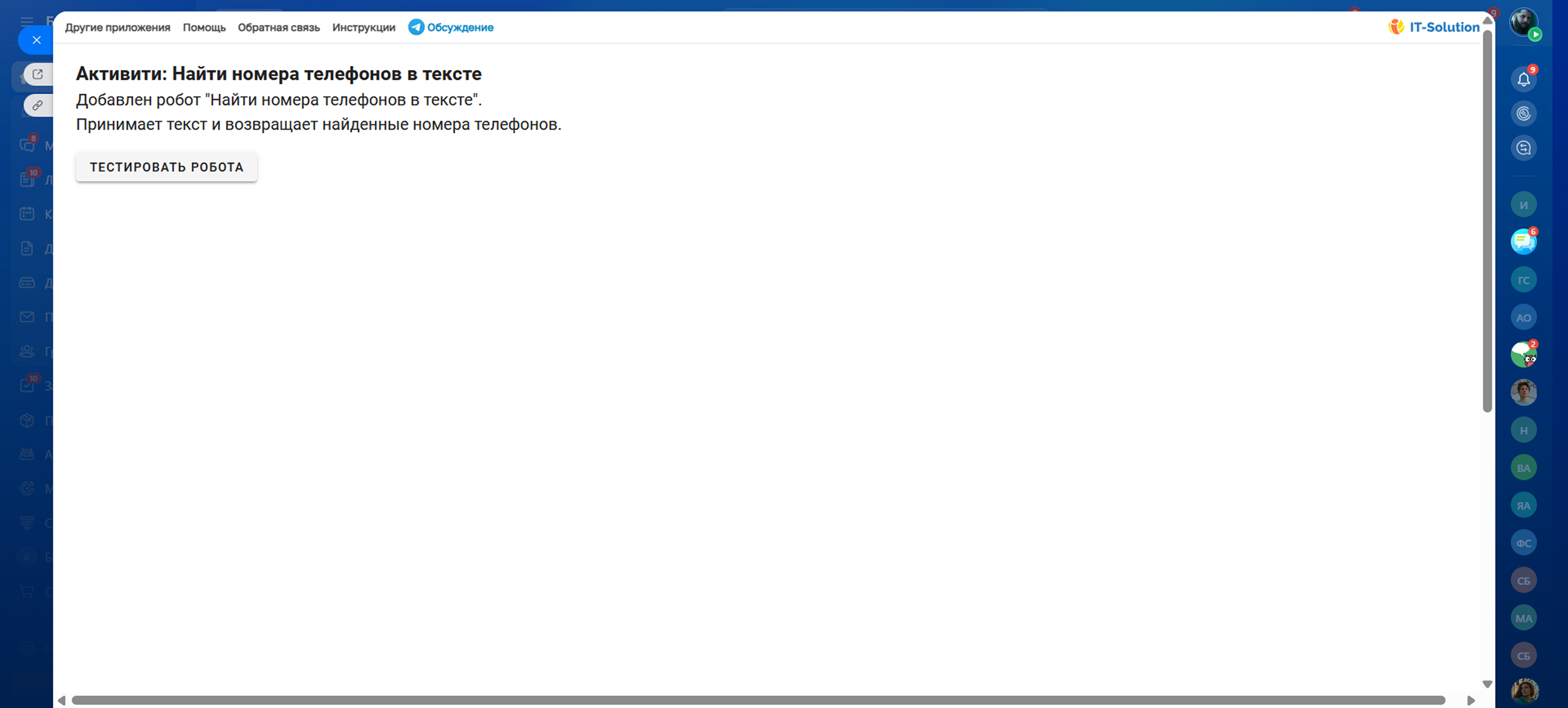 Приложение добавляет на портал робота и действие БП "Найти номера телефонов в тексте".