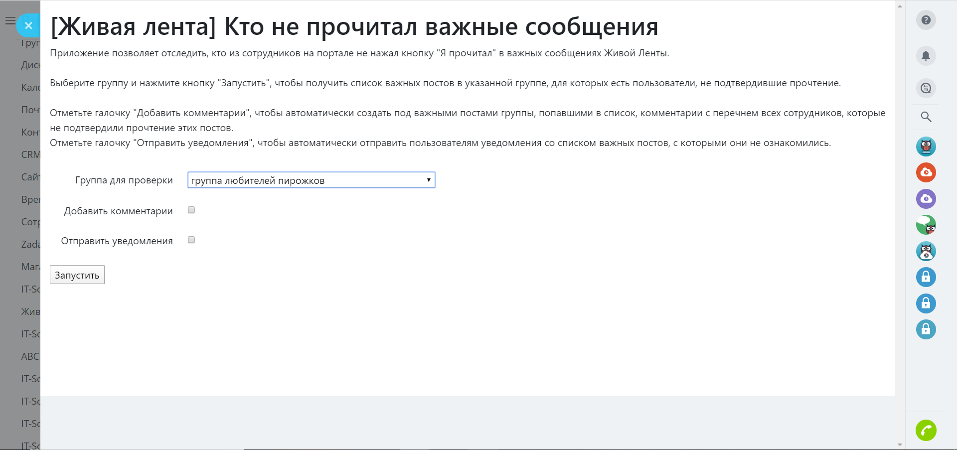 Выберите группу, где ищете посты, отметьте галочками, хотите ли вы отправить уведомление тем, кто не прочитал, а также создать под постом комментарий со списком неознакомившихся коллег. Всего одно нажатие кнопки и вы будете в курсе, как обстоят дела!