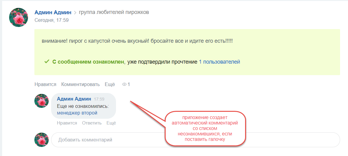 Благодаря приложению "Кто не прочитал важное сообщение" вы сможете легко найти все посты группы, где остались сотрудники, не отметившие факт прочтения, и напомнить им ознакомится и подтвердить это.