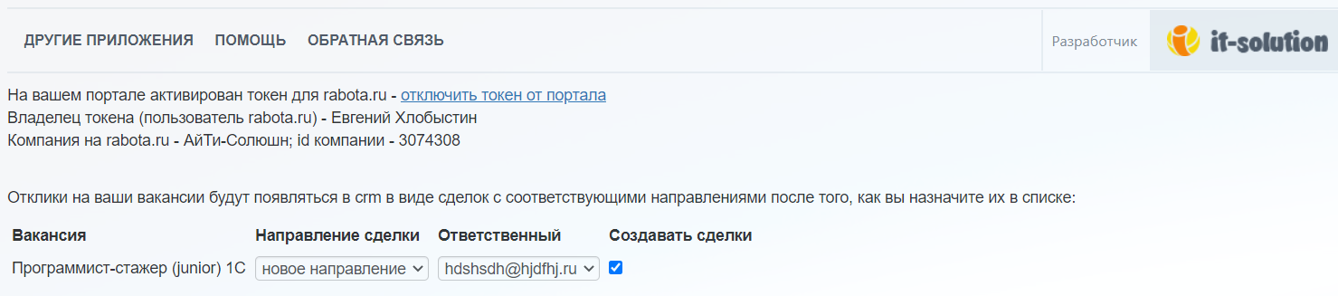 После авторизации в приложение подтянутся все вакансии, имеющиеся на данный момент. Отклики на ваши вакансии будут появляться в CRM в виде сделок с соответствующими направлениями после того, как вы назначите их в списке. Выгрузка откликов происходит раз в 10 минут: если за это время появились невыгруженные на портал отклики, то они выгрузятся, если новых не было, то ничего не произойдет.