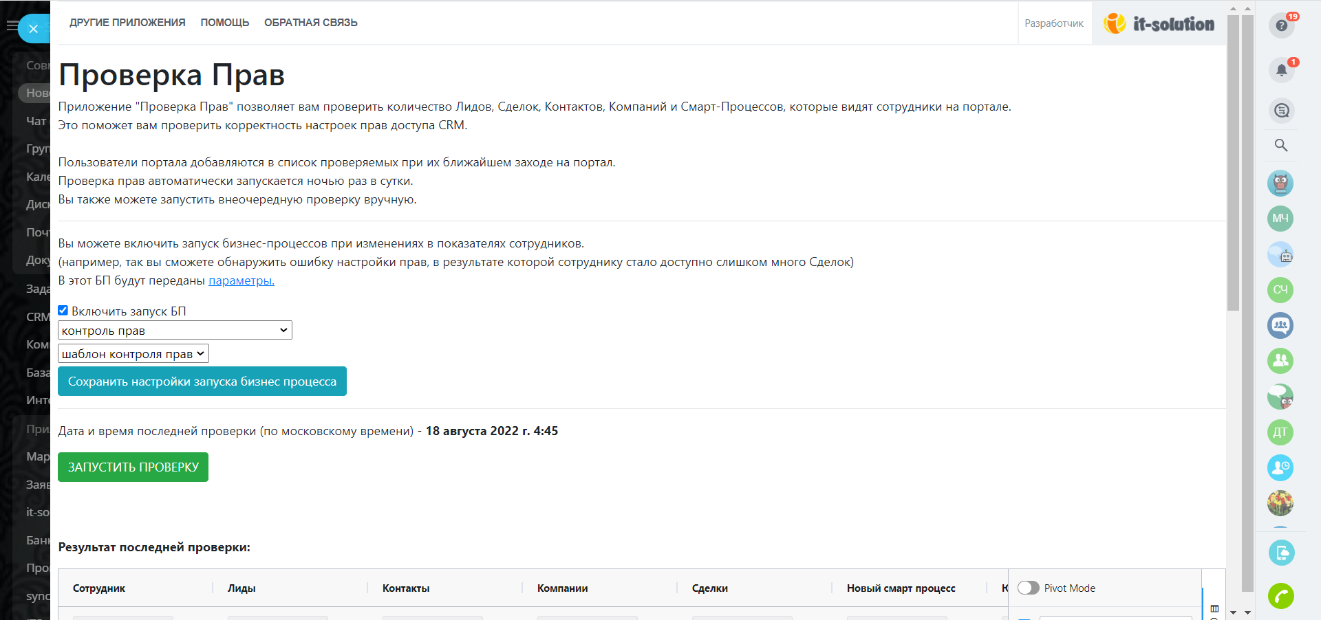 Приложение "Проверка Прав" позволяет вам проверить количество Лидов, Сделок, Контактов, Компаний и Смарт-Процессов, которые видят сотрудники на портале.