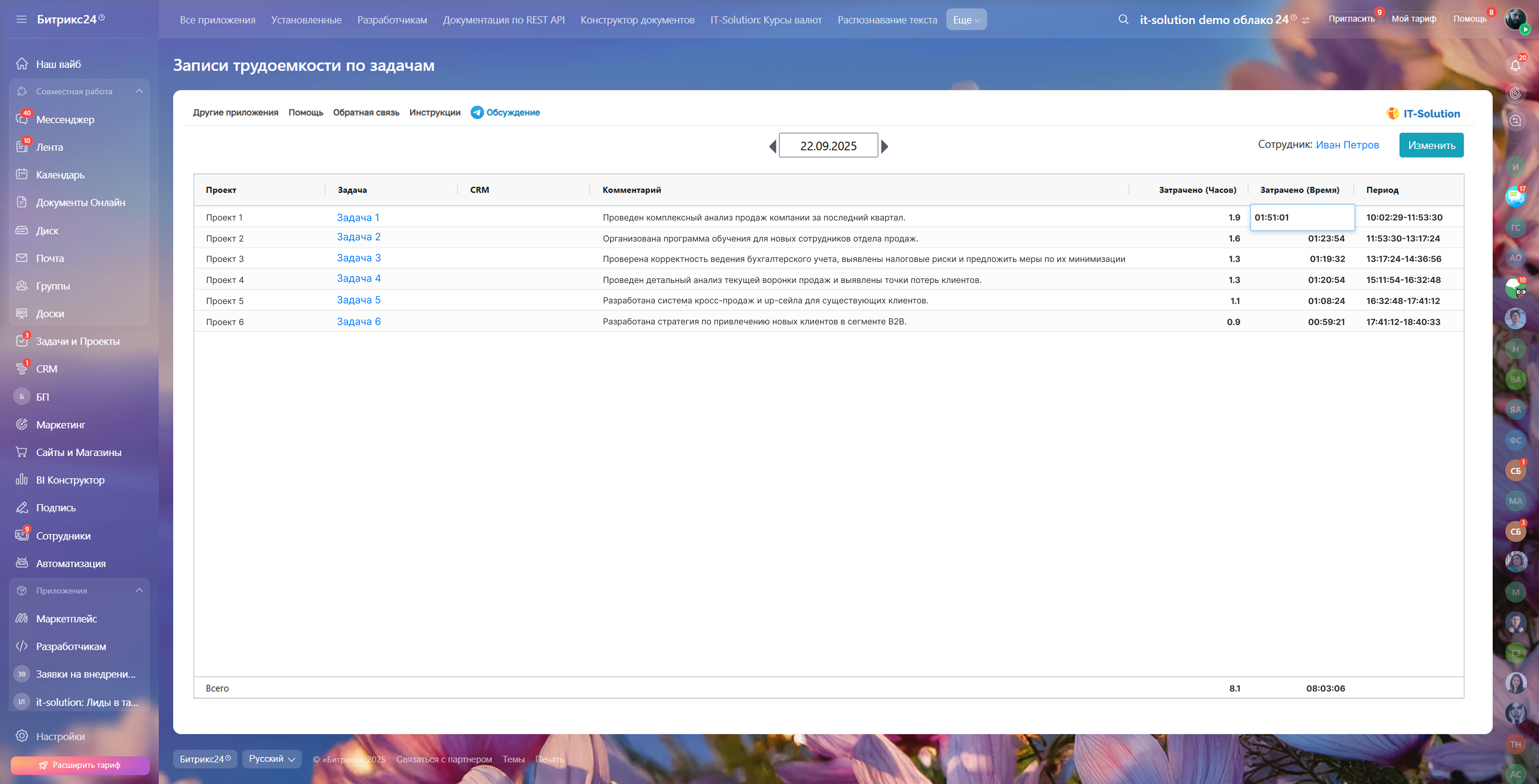 Приложение выводит ежедневный отчет в виде списка задач, куда в этот день вносил время выбранный сотрудник. Увидеть можно только те задачи, к которым у вашего пользователя есть доступ. Например, если вы обычный сотрудник, вы можете посмотреть отчет ваших коллег по тем задачам, к которым у вас имеется доступ, а если вы администратор, то сможете увидеть отчет по любому сотруднику на портале. Любой пользователь может просматривать собственный отчет.