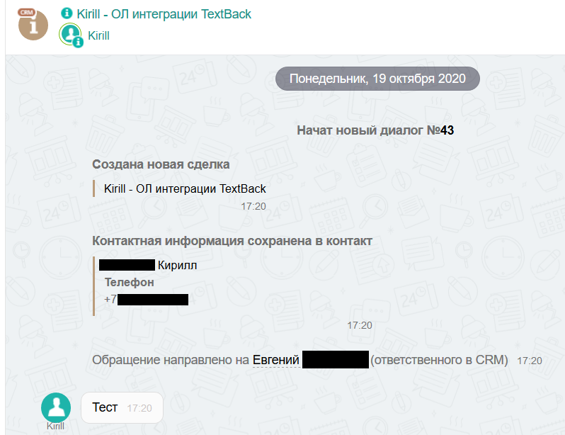 Автоматически получать все сообщения из WhatsApp и добавлять их в Контакты и Сделки;