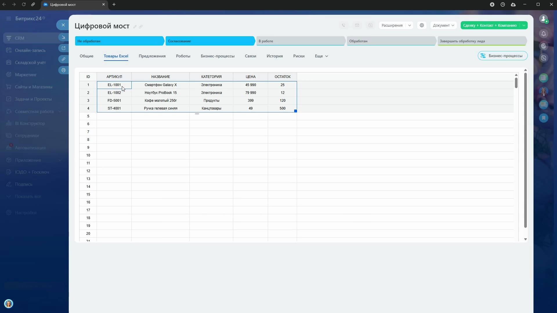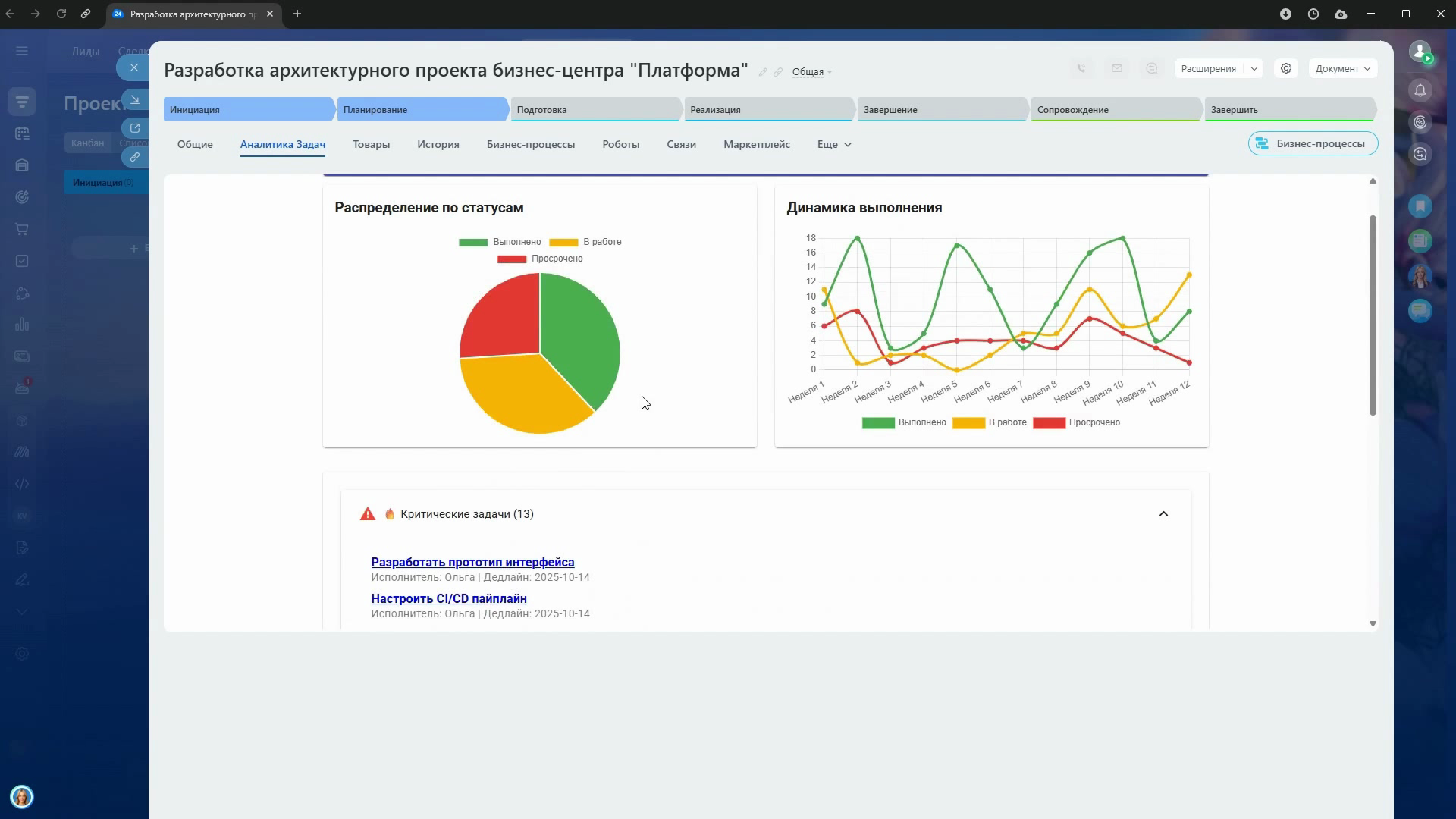 полный доступ: чтение, добавление, изменение и удаление процессов, стадий, элементов, записей таймлайна. Можно выполнять задания