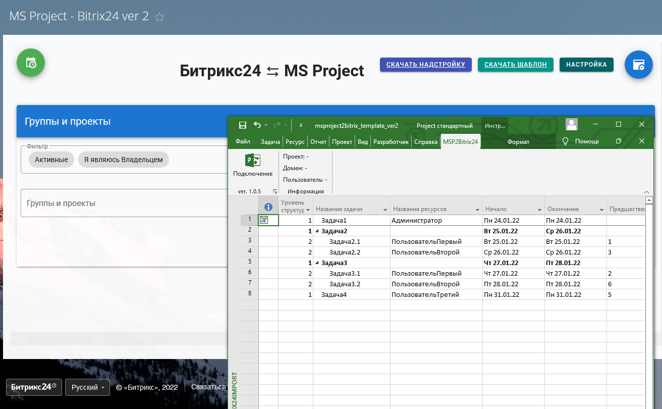 Отличия приложения "MS Project ⇆ Bitrix24" от "MS Project ⇆ Bitrix24" : учтены пожелания пользователей, добавлена надстройка в MS Project, позволяющая автоматически экспортировать/импортировать в Bitrix24