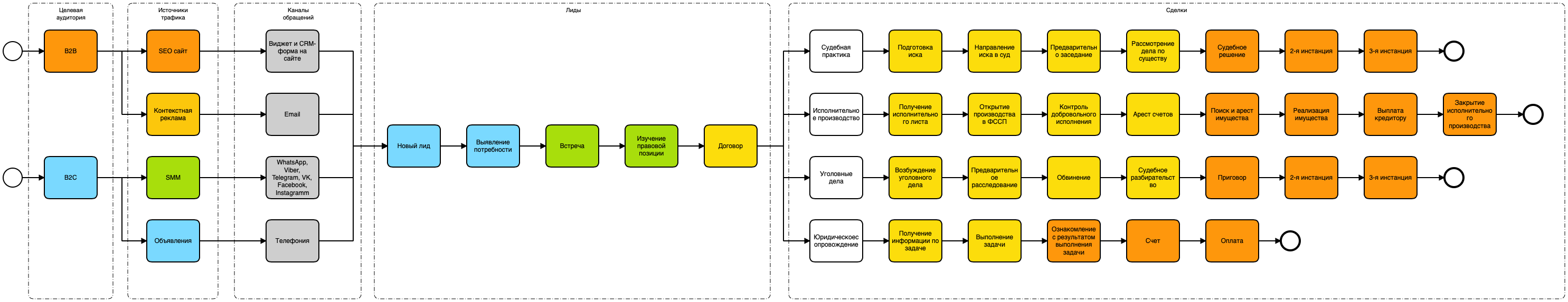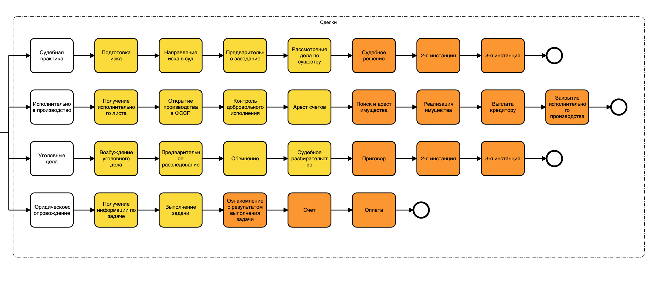 - 4 направления сделок: «Судебная практика», «Исполнительное производство», «Уголовные дела» и "Юридическое сопровождение".