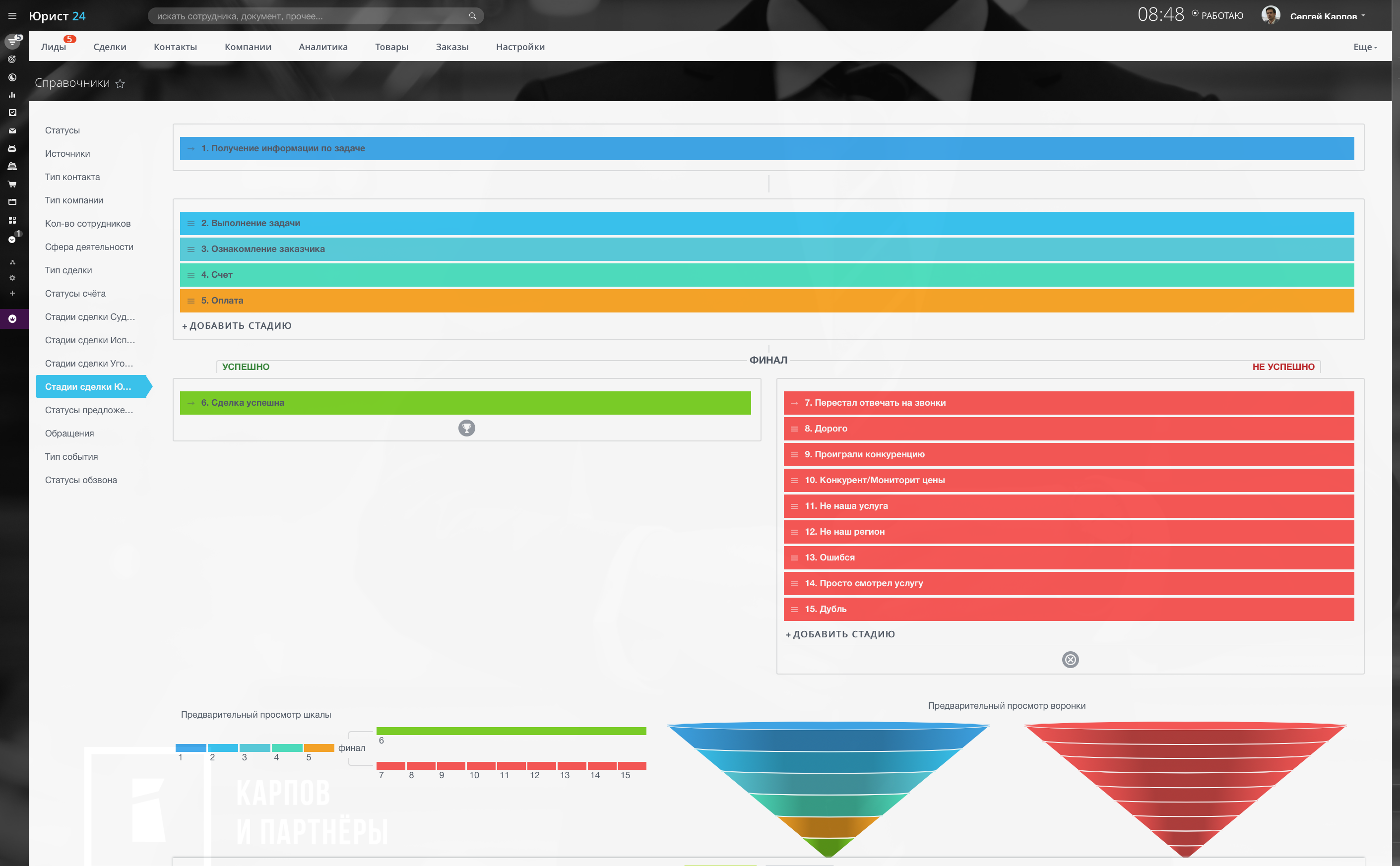 Негативные стадии для разделов лид и сделки: