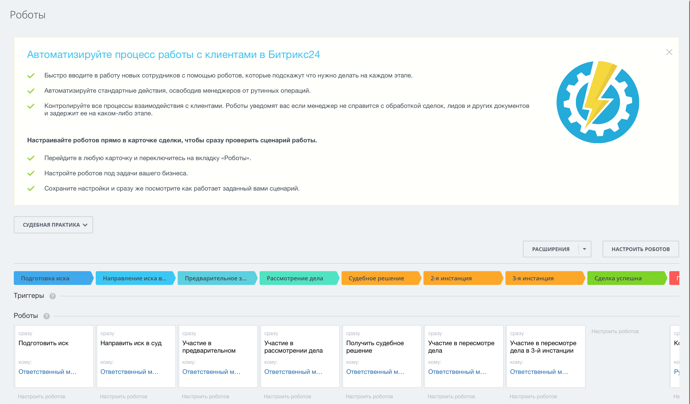 Отраслевое решение включает себя лиды и сделки: судебная практика, исполнительное производство, уголовные дела, юридическое сопровождение.