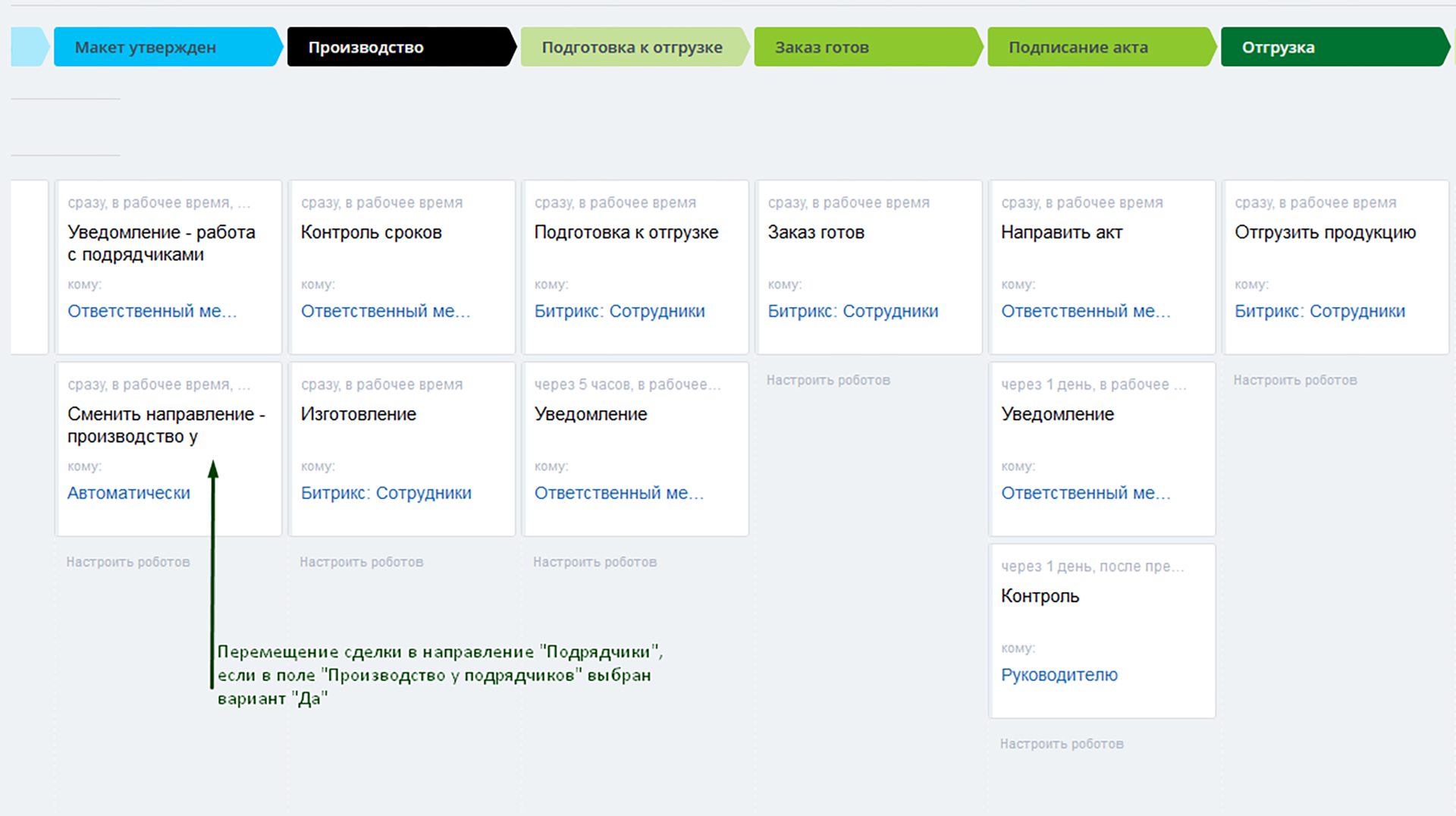 9) Подготовка к отгрузке. Из направления «подрядчики» на данную стадию будет скопирована сделка. Произойдет это в том случае, если в ее карточке был выбран вариант «да» в поле «производство у подрядчиков».
