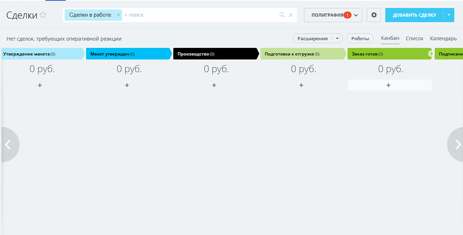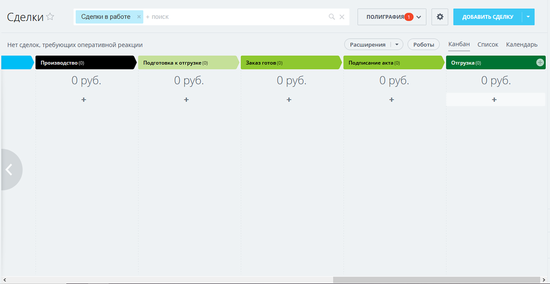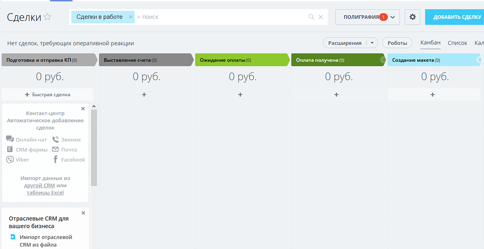 - 2 направления сделок: «Полиграфия» и «Подрядчики».