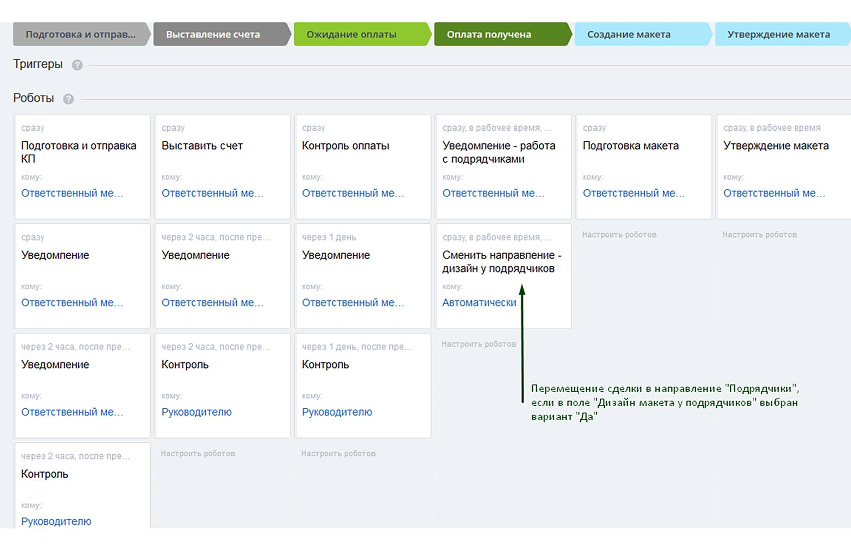4) Оплата получена. На данной стадии в случае, если в поле «дизайн макета у подрядчиков» выбран вариант «да», сделка будет перемещена в направление «подрядчики», а менеджер получит соответствующее уведомление о необходимости контролировать выполнение работы ими.
