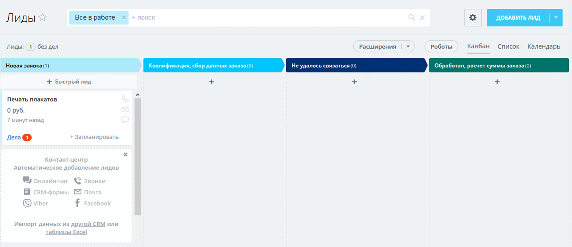 1) Новая заявка. На данную стадию попадают заявки из всевозможных источников и формируются карточки лидов. Задача менеджера – начать работу с заявкой, т.е. переместить карточку лида на следующий этап. Роботы напомнят менеджеру о том, что необходимо сделать, а если в течение дня лид не начнет обрабатываться, руководитель получит уведомление об этом.