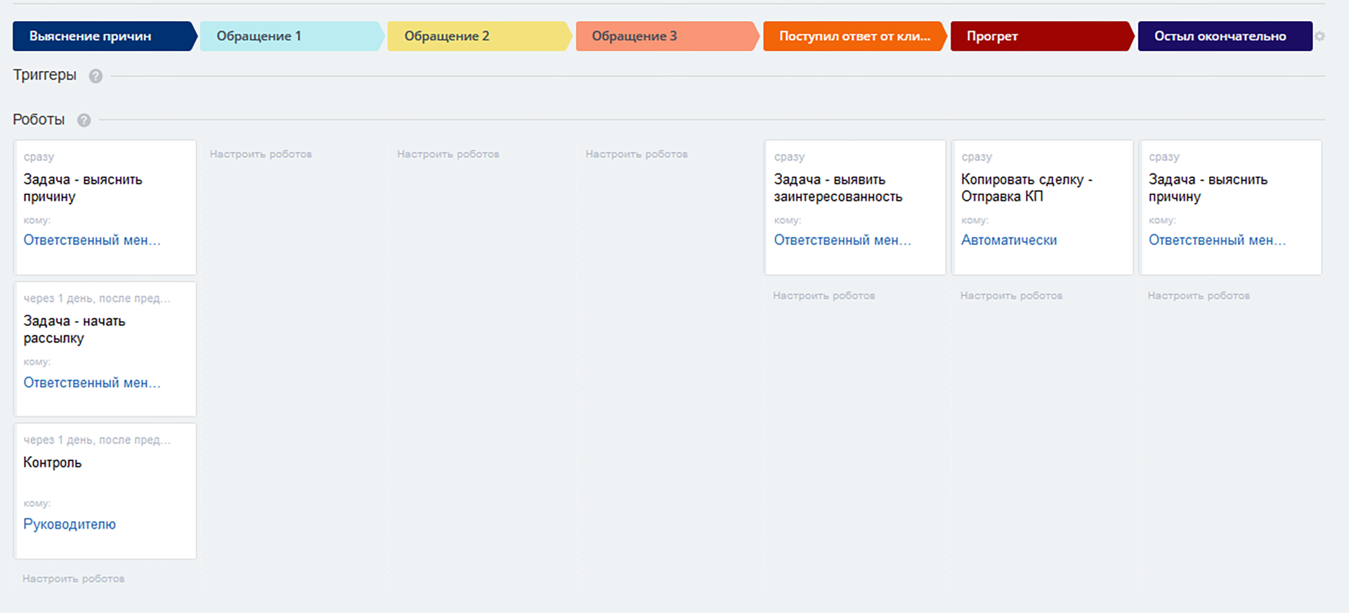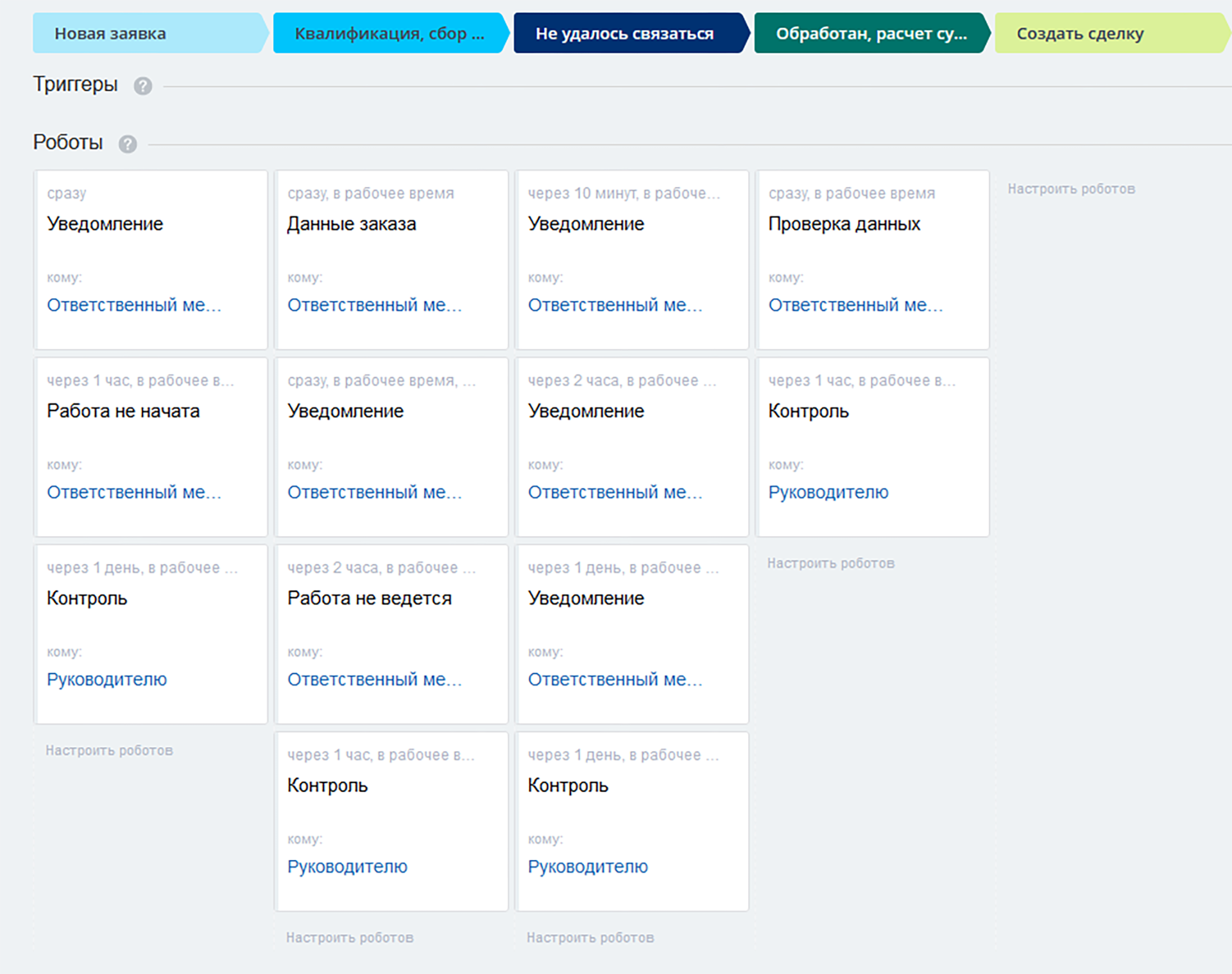 Во всех направлениях сделок и на этапах лидов добавлены роботы, ставящие соответствующие задачи Вашим менеджерам, уведомляющие их о необходимости в дальнейших действиях, а также роботы контроля сроков выполнения работы. С полным списком роботов Вы можете ознакомиться на лендинге отраслевого решения.