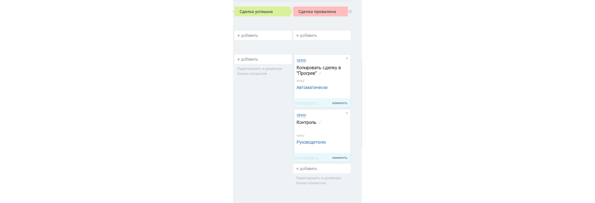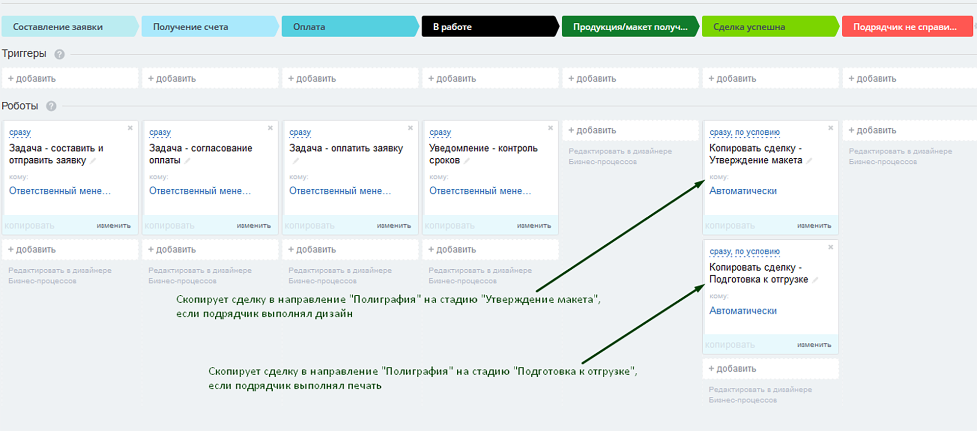 В случае успешного прохождения сделки по данному направлению и достижения положительной стадии, ее карточка будет автоматически скопирована в направление «Полиграфия» на стадию «Подготовка и отправка КП».