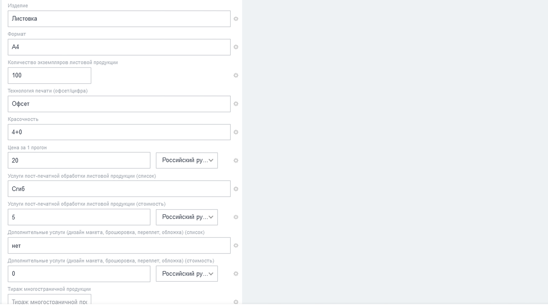 Стоимость заказа = («Цена 1 прогона» + «Цена пост-печатной обработки для 1 листа») * «Количество листов» + «Стоимость дополнительных услуг».