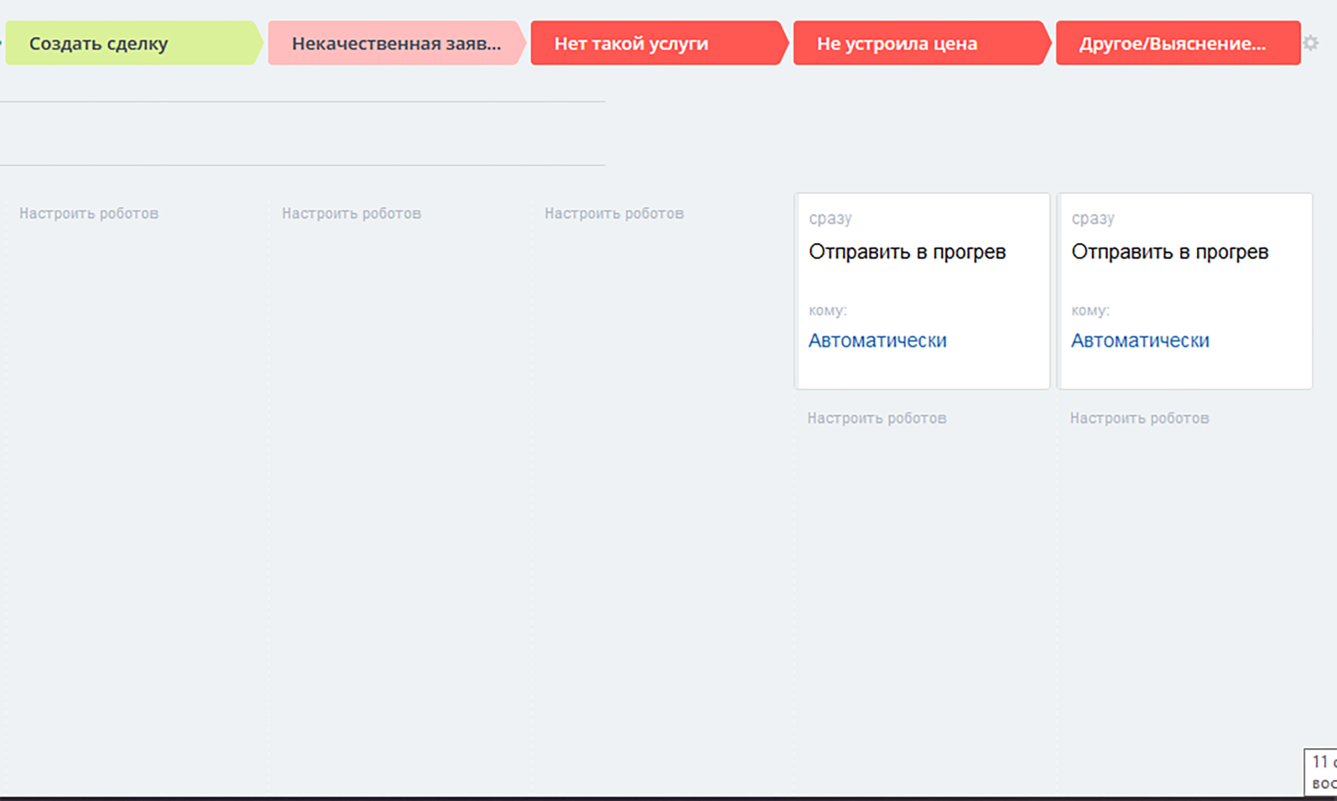 При помещении карточки лида на негативные стадии 3 и 4, робот автоматически переместит их в направление сделок «Прогрев» для дальнейшей работы с отказом