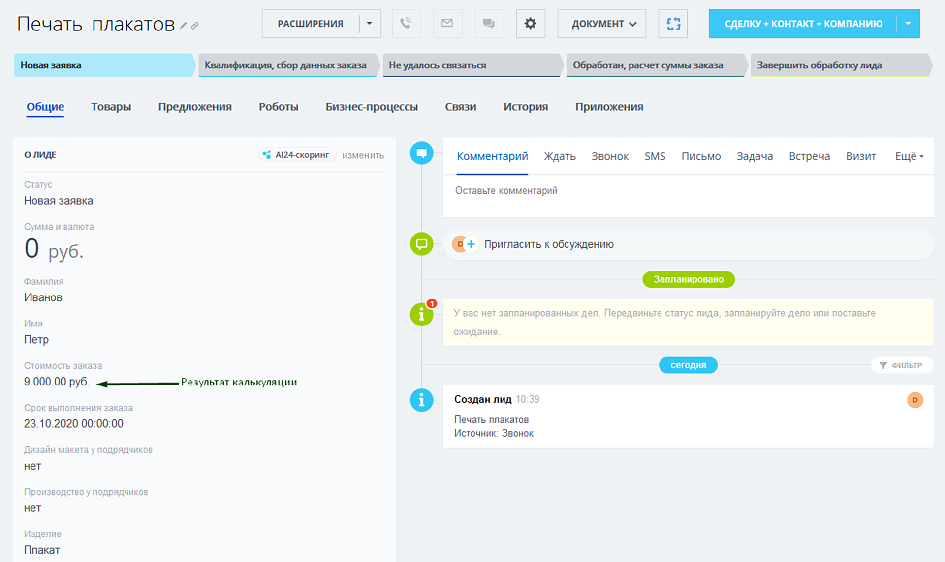 2) Квалификация, сбор данных заказа. На данной стадии задача менеджера – связаться с потенциальным клиентом по контактным данным из лида и выявить потребность в услугах компании (произвести квалификацию). После чего, если данная заявка качественная, необходимо собрать информацию по заказу: вид продукции, количество экземпляров, цветность, технология печати, сроки выполнения заказа. Роботы сами напомнят менеджеру о необходимости в дальнейших действиях. В случае, если работа не будет производиться, руководителю поступит соответствующее уведомление.