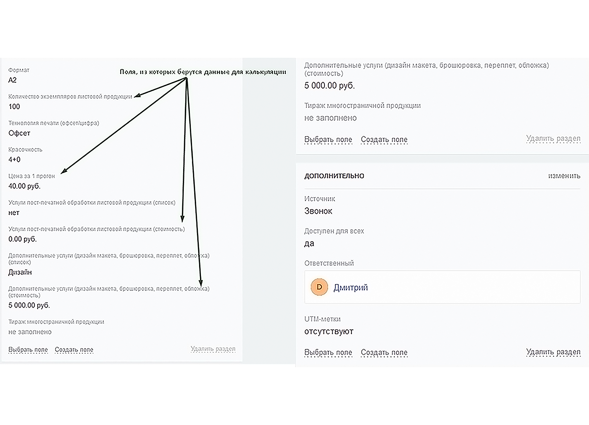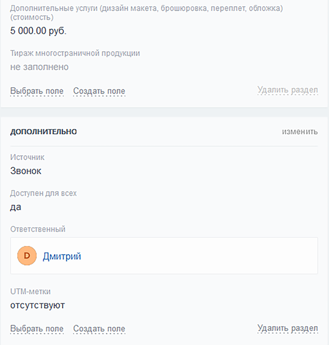 7) Настроенные под нужды типографии пользовательские поля в карточках лидов и сделок.