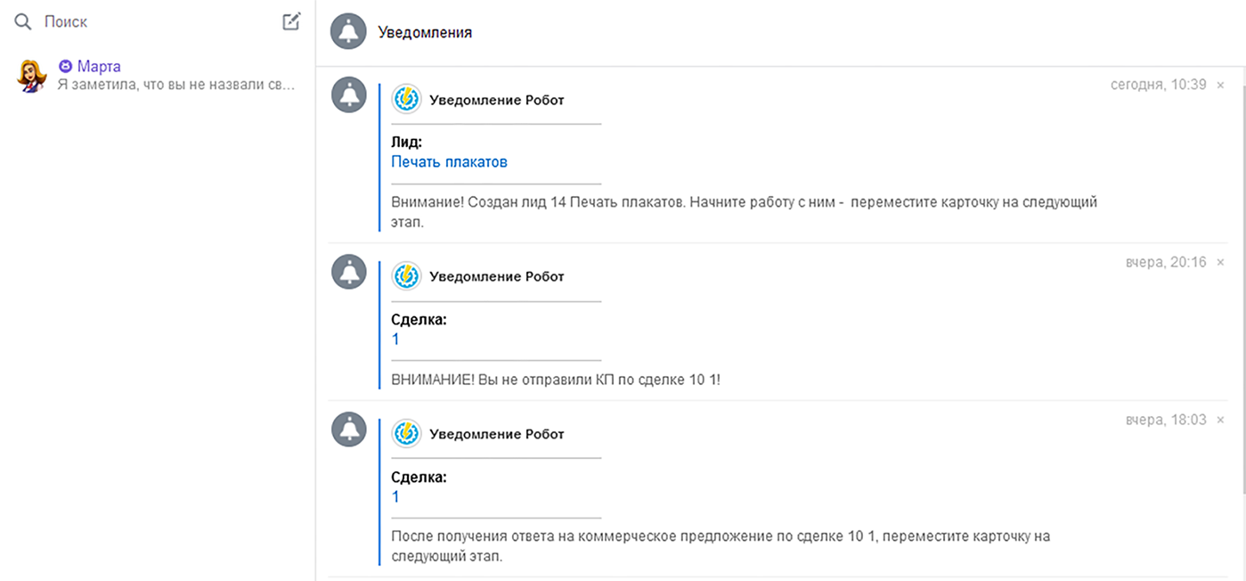 3) Настроенных роботов, которые будут автоматически уведомлять Ваших менеджеров о дальнейших действиях и ставить им задачи (доступно на всех трех тарифах).