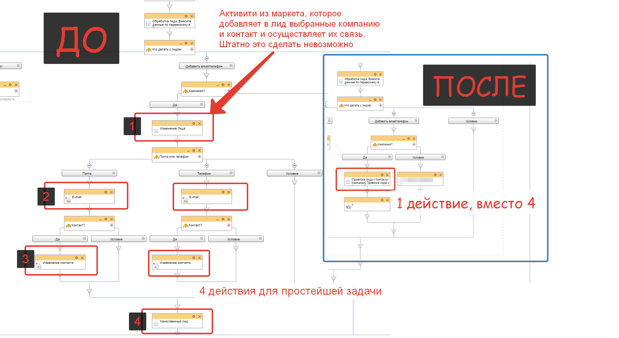Ситуация - существующий в базе контрагент звонит с нового телефона или присылает письмо с нового email. Штатного действия в дизайнере БП для привязки этого лида к существующим сущностям нет. Нужно гнать пользователя в карточку лида, давать ему права на изменение лида, учить работать с карточкой.