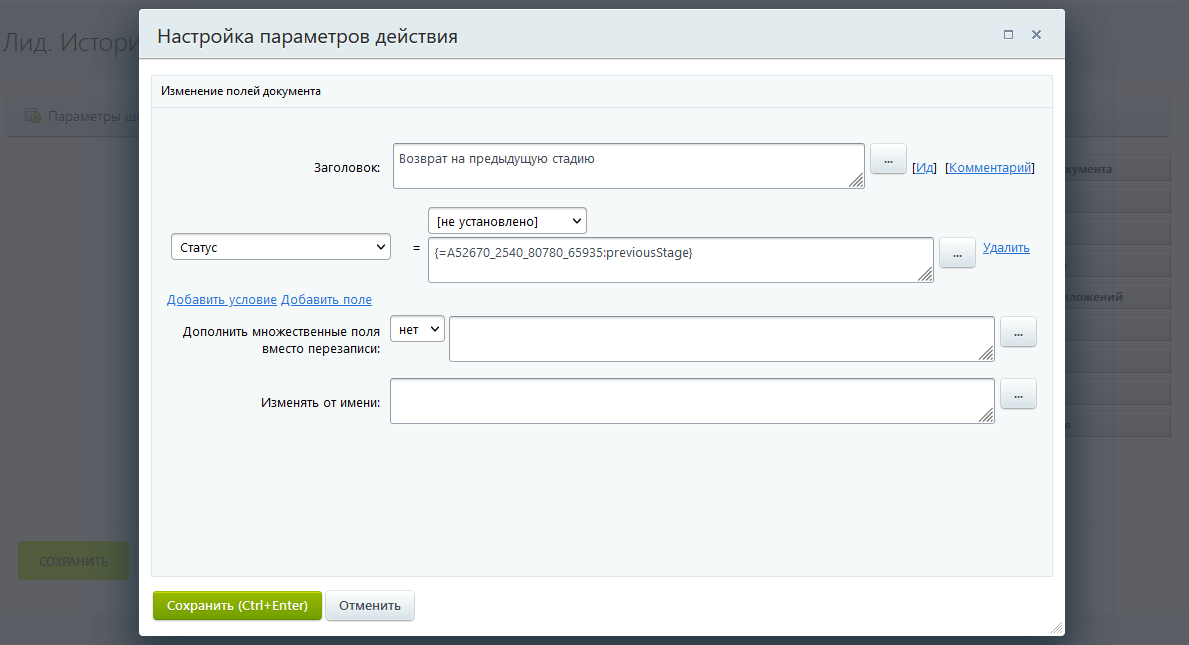 Данное приложение решает эту проблему, определяя предыдущую стадию, на которой находился Лид, Сделка, счёт или элемент смарт-процесса. Этот результат можно передать в стандартное действие "Изменение документа" и автоматически "откатить" некорректное перемещение.