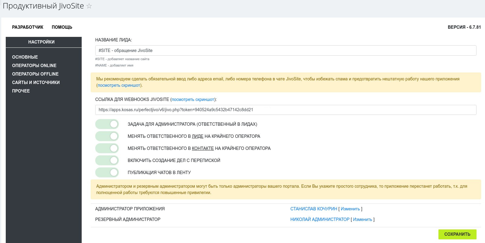 - Для решения внештатных ситуаций в приложении "Продуктивный Jivosite" существует двойной уровень безопасности работы. При установке приложения пользователь, который произвёл инсталляцию становится главным администратором приложения. После установки программы главному администратору приложения необходимо выбрать резервного администратора приложения на тот случай, когда первый администратор не сможет своевременно помочь решить внештатную ситуацию или попросту будет уволен.