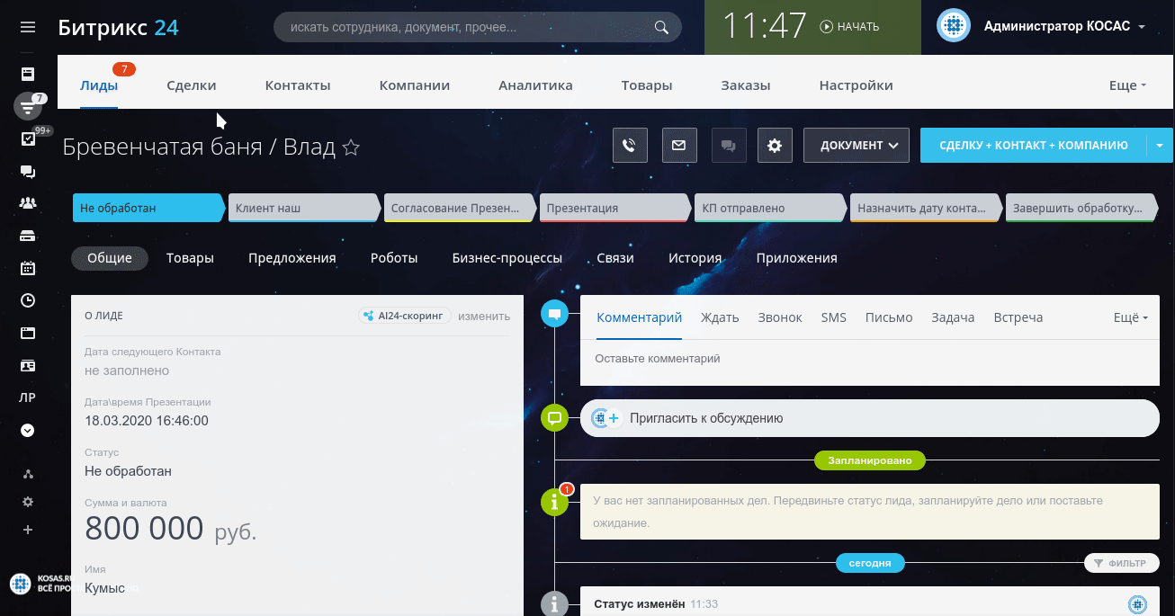 Задачи — это всего лишь частный пример, можно использовать роботов чтобы видеть просроченные Лиды, Сделки, брошенные Контакты, Компании.
