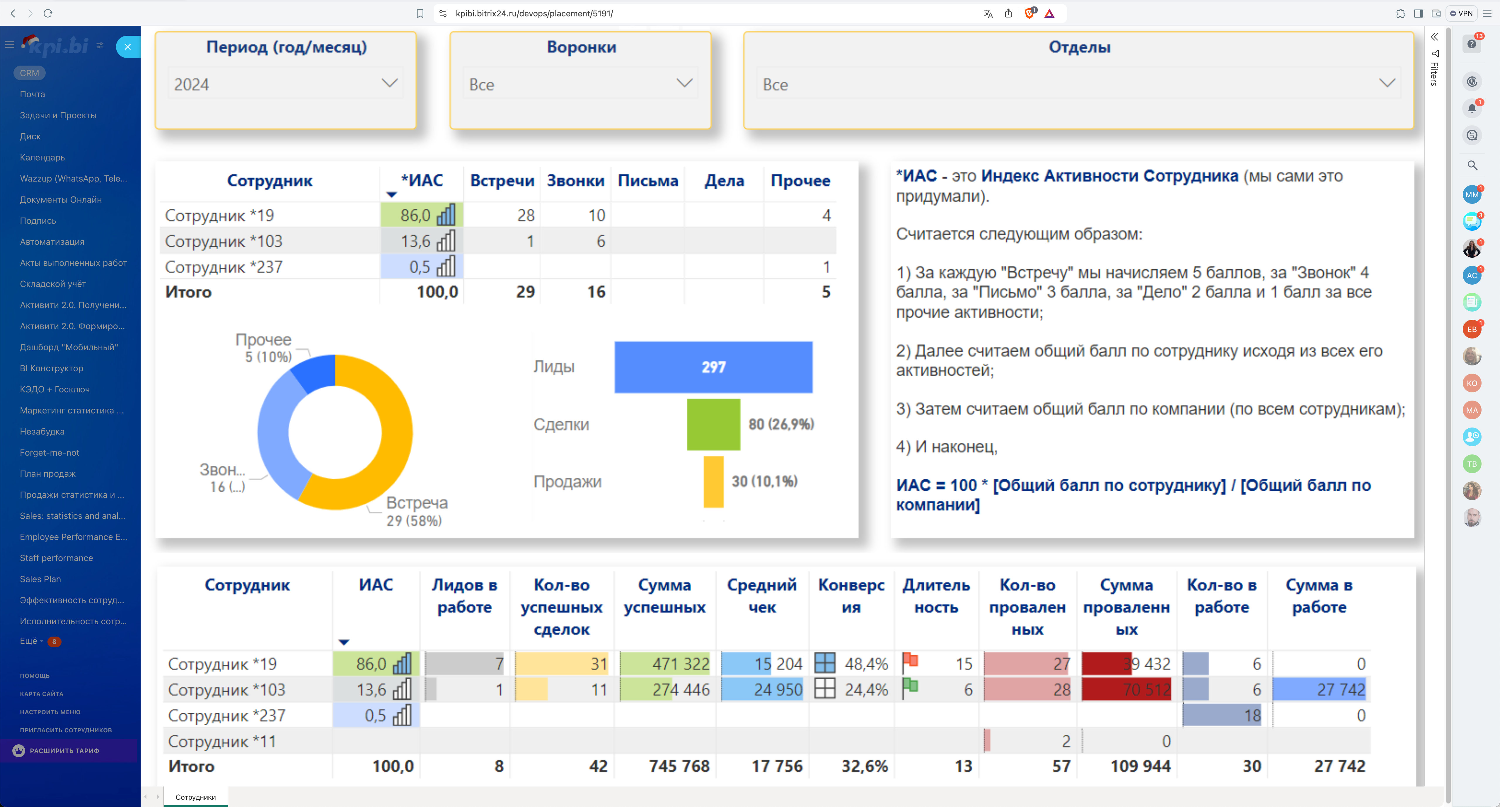- ИАС - индекс активности сотрудника (задачи, письма, звонки);