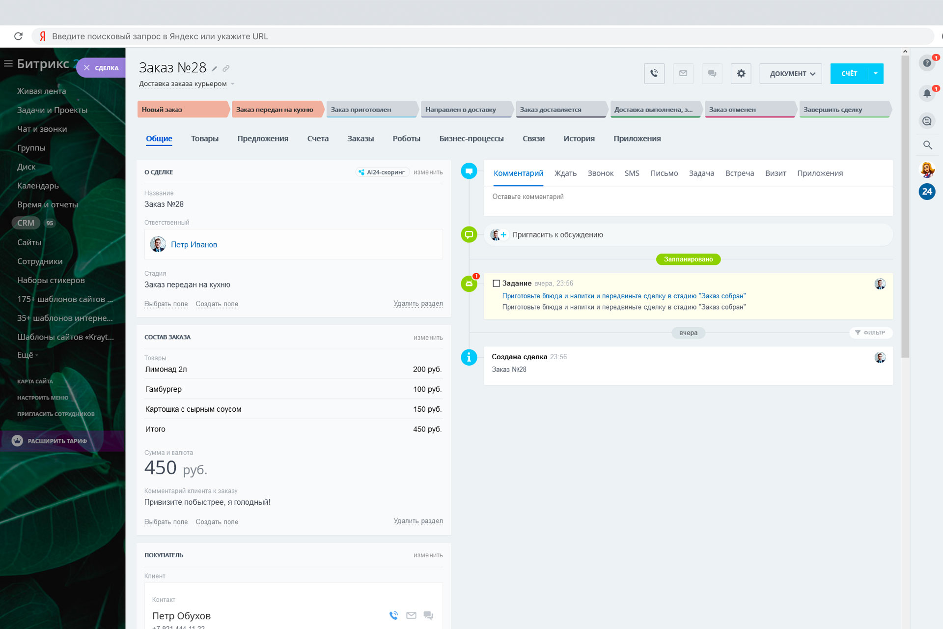 Готовая, уже настроенная отраслевая CRM для ресторанного бизнеса с доставкой поможет вам быстро начать работать с Битрикс24 и эффективно управлять всеми основными операционными процессами вашей компании в онлайне.