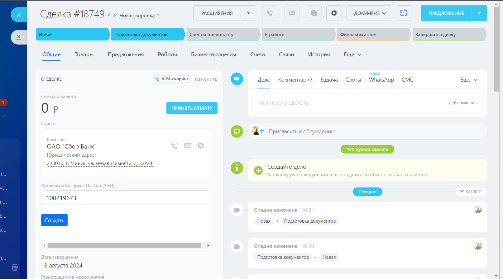 Обновление от 27.03.2024 г.: поддержали сценарий создания компании и реквизитов по УНП в карточке сделки, с переименованием созданной карточки компании и проверкой на дубликат по имеющимся реквизитам компании в CRM