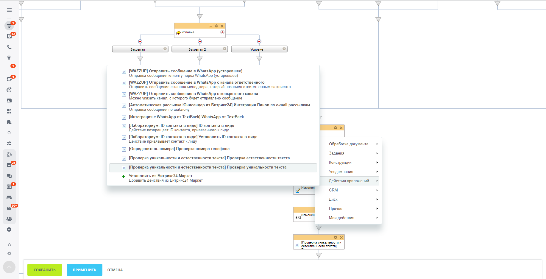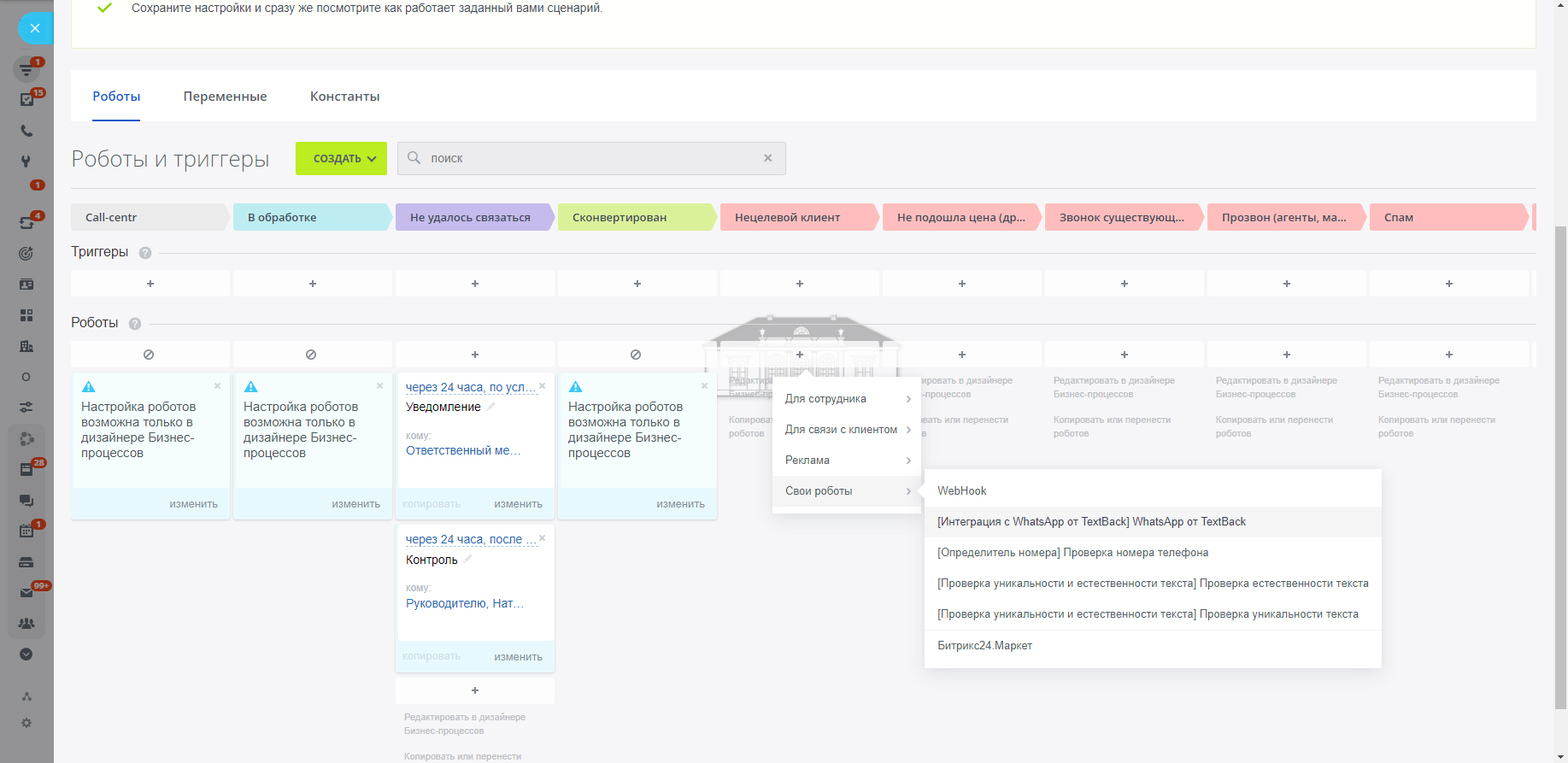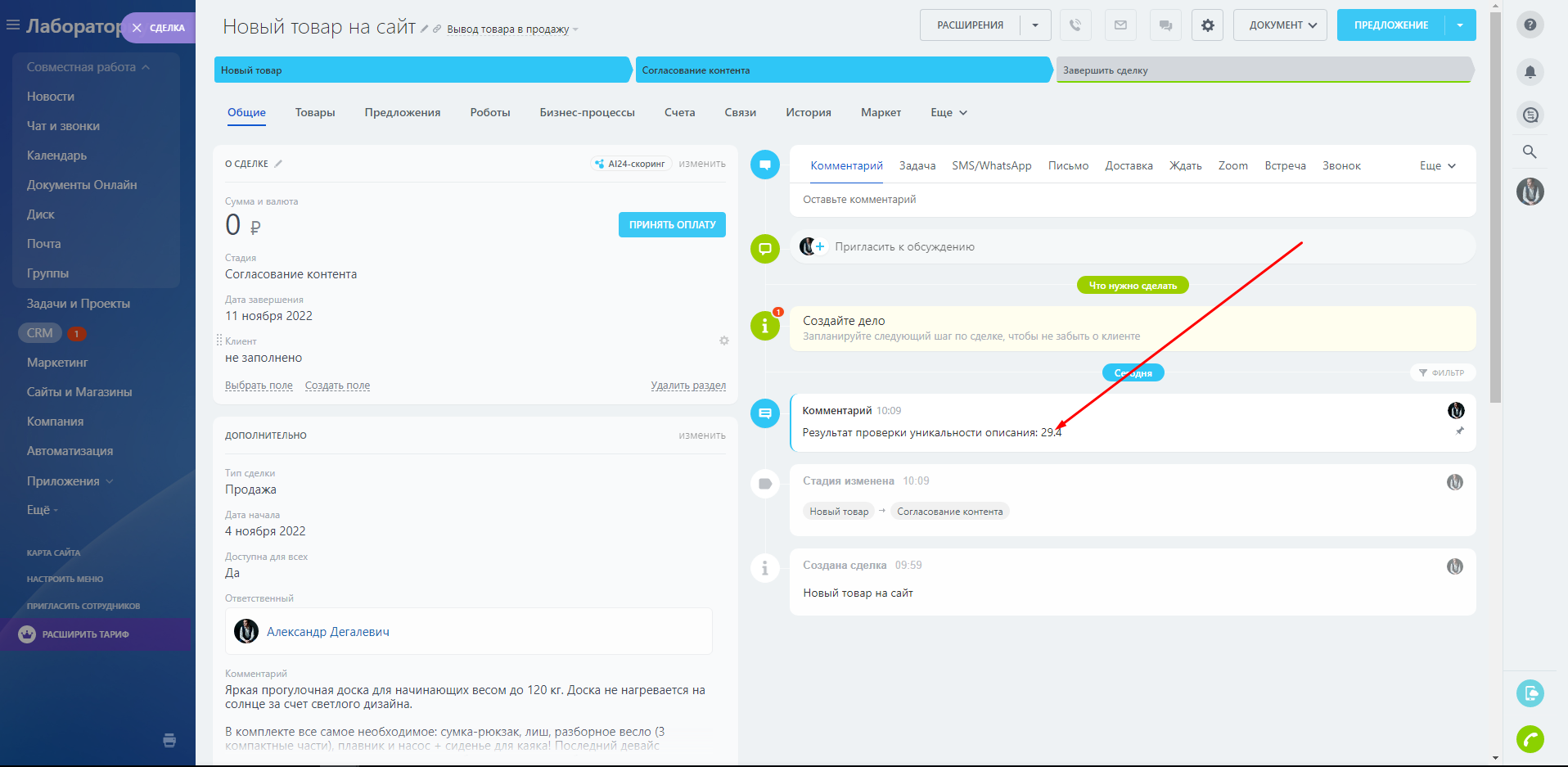 Включите роботов в процесс обработки лидов или сделок, если материалы согласовываются в CRM. Или используйте активити проверок в дизайнере бизнес-процессов в списках, бизнес-процессах в ленте или в инфоблоках. Можно проверять как отдельно тексты, так и страницы сайтов по их адресам.