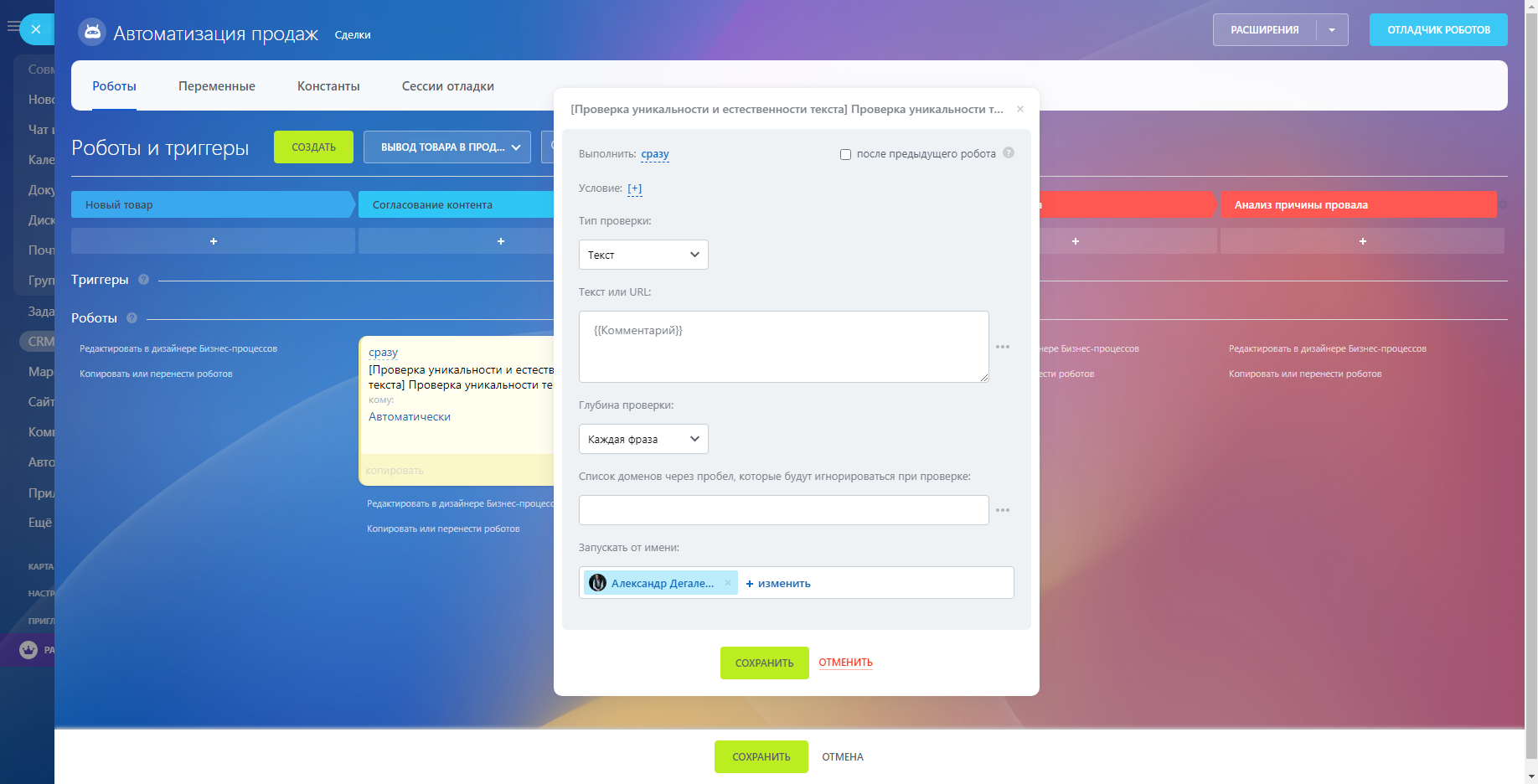 Роботы и активити бизнес-процессов помогут автоматически проверить тексты на уникальность и естественность и помогут авторам текстов или специалистам по SEO сразу внести необходимые корректировки.