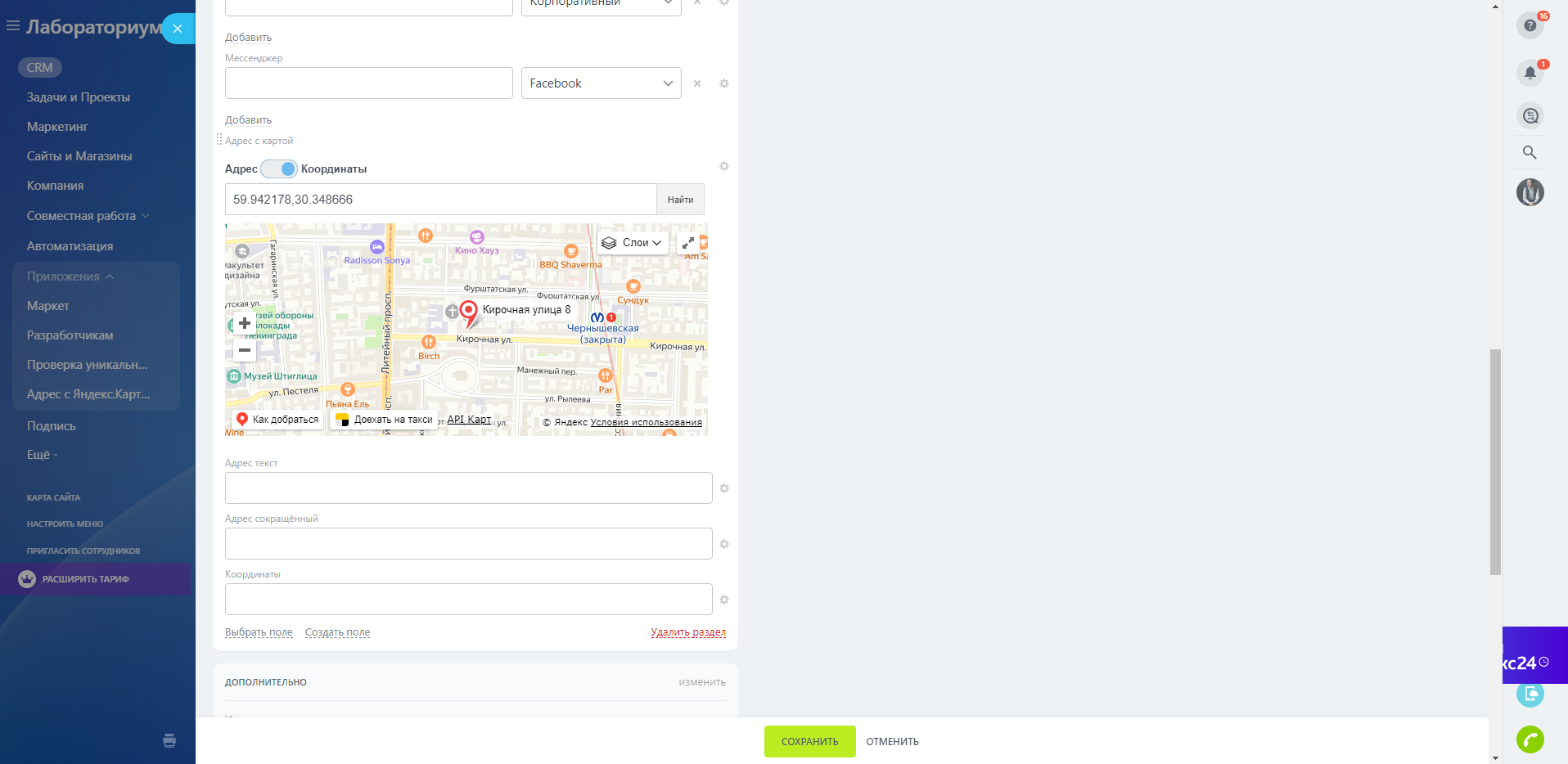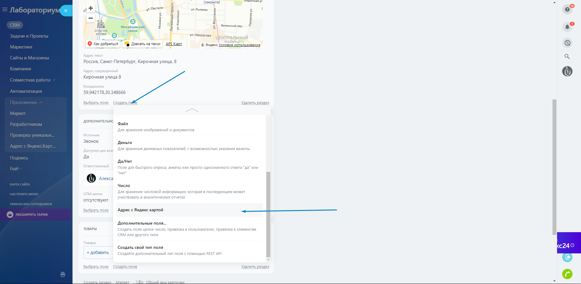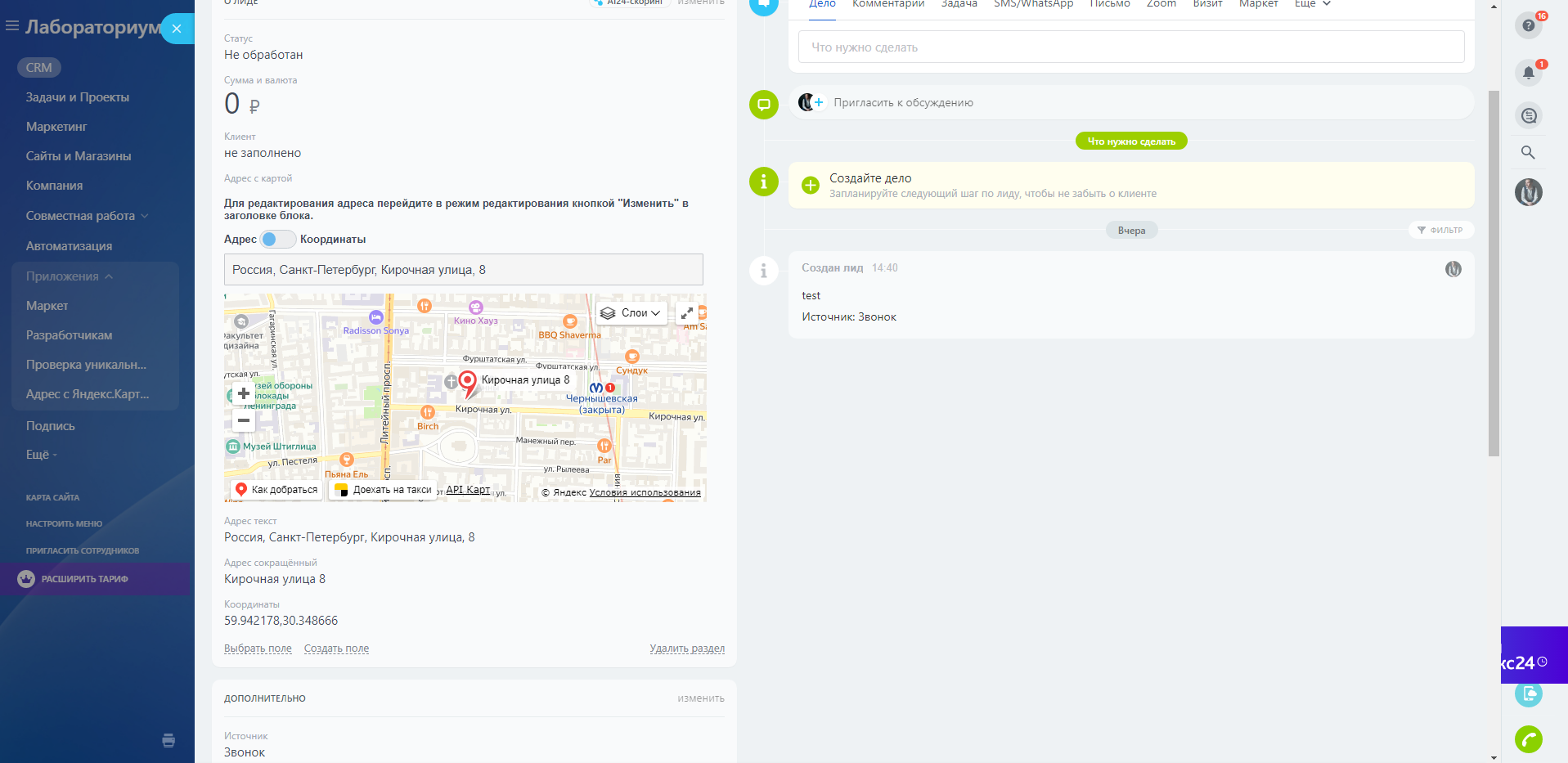 Например, на первом этапе обработки лида мы заполняем поле адреса с Яндекс картой.