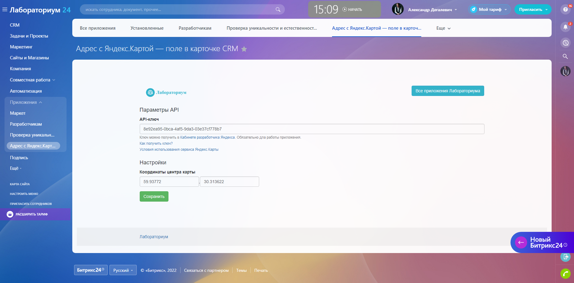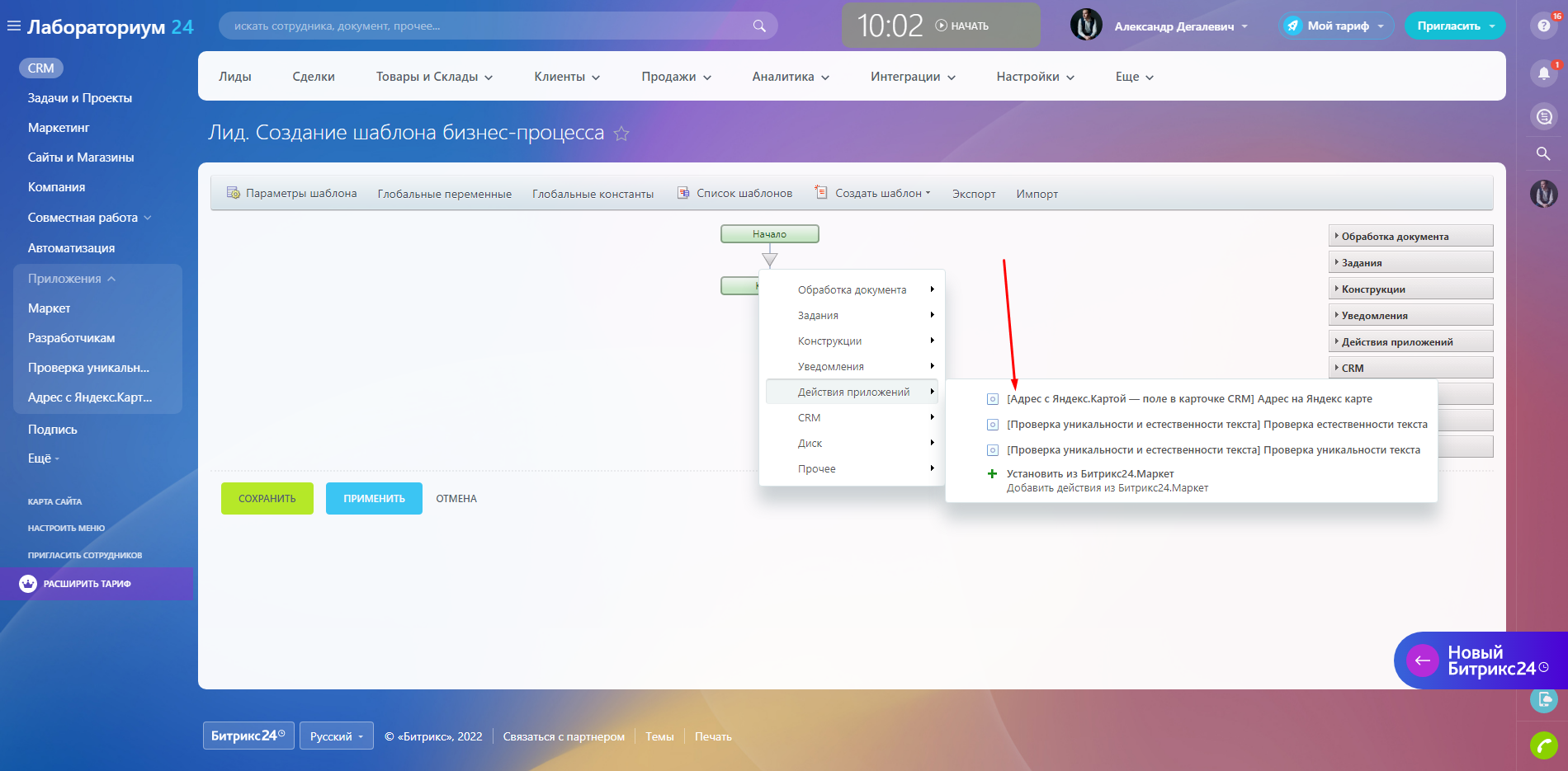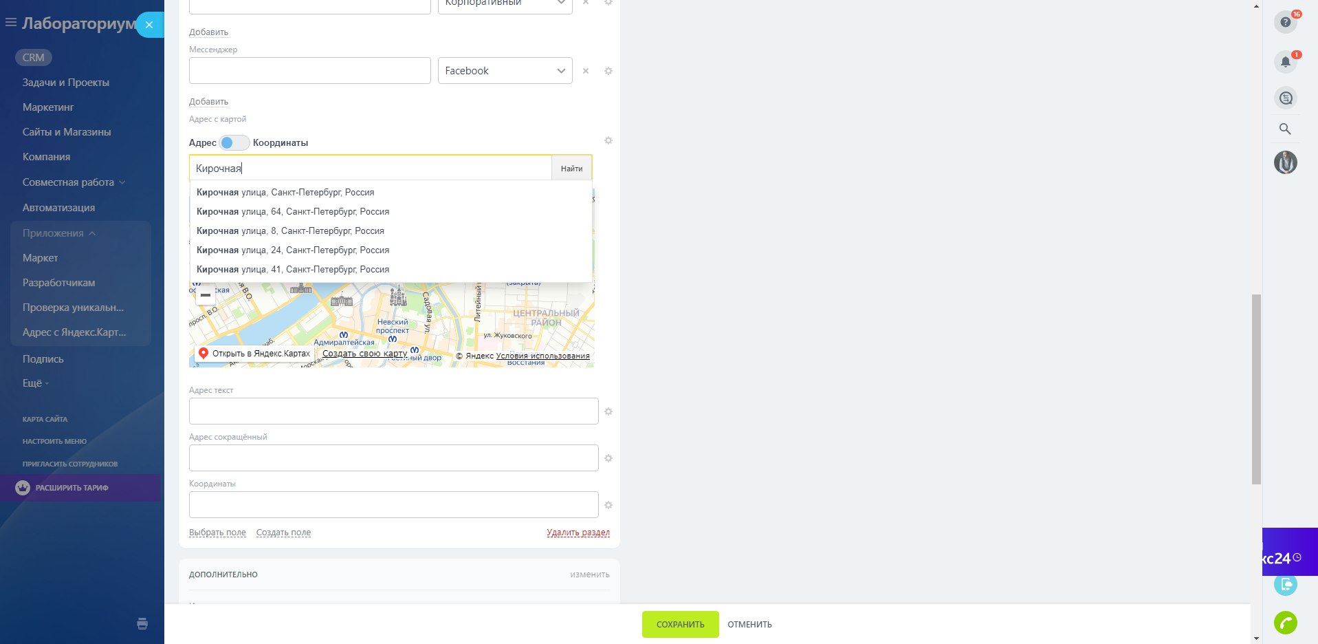 Например, на первом этапе обработки лида мы заполняем поле адреса с Яндекс картой.