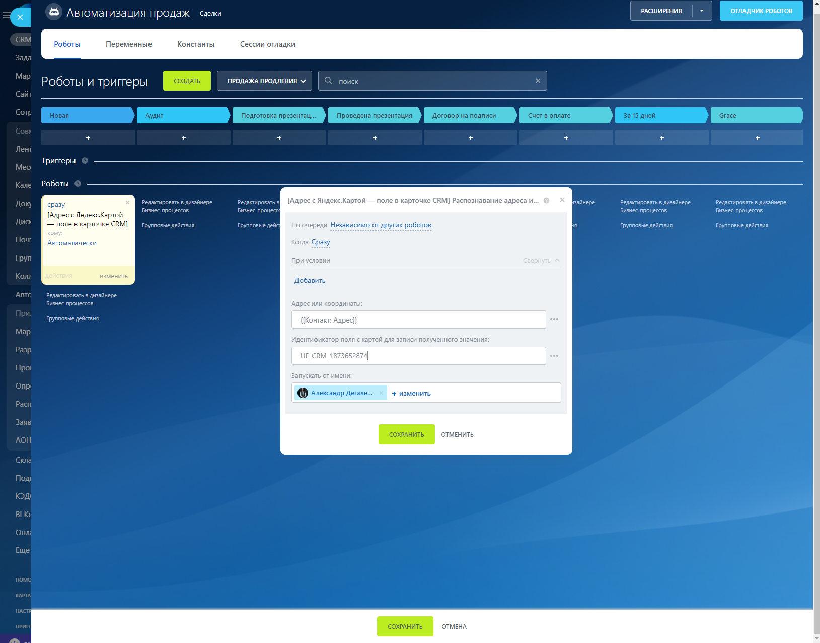 На второй этап можем добавить роботов, которые при переключении лида в соответствующий статус сохранят адрес и координаты в отдельные текстовые поля.