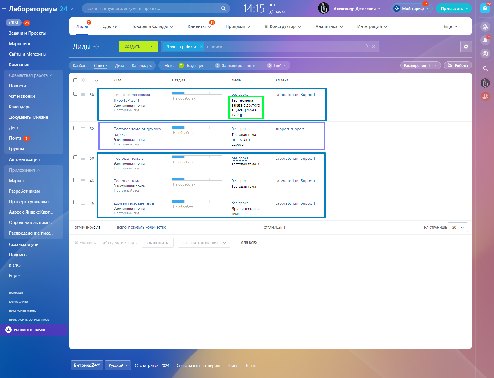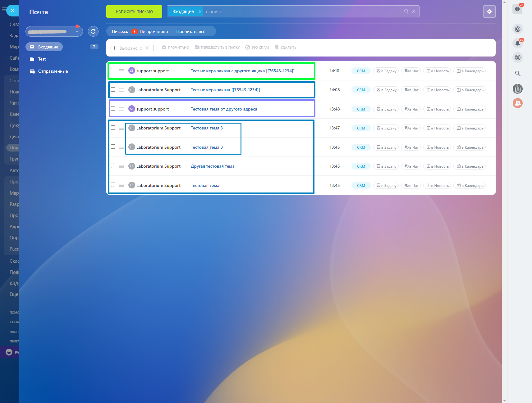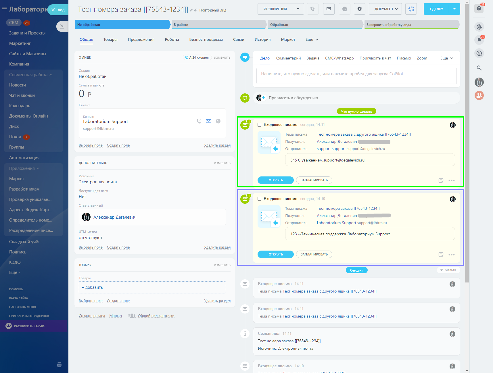 Приложение обнаружило среди этих писем существующий в другом лиде номер заказа и перенесло письмо в зелёной рамке в лид, созданный ранее для другого отправителя.