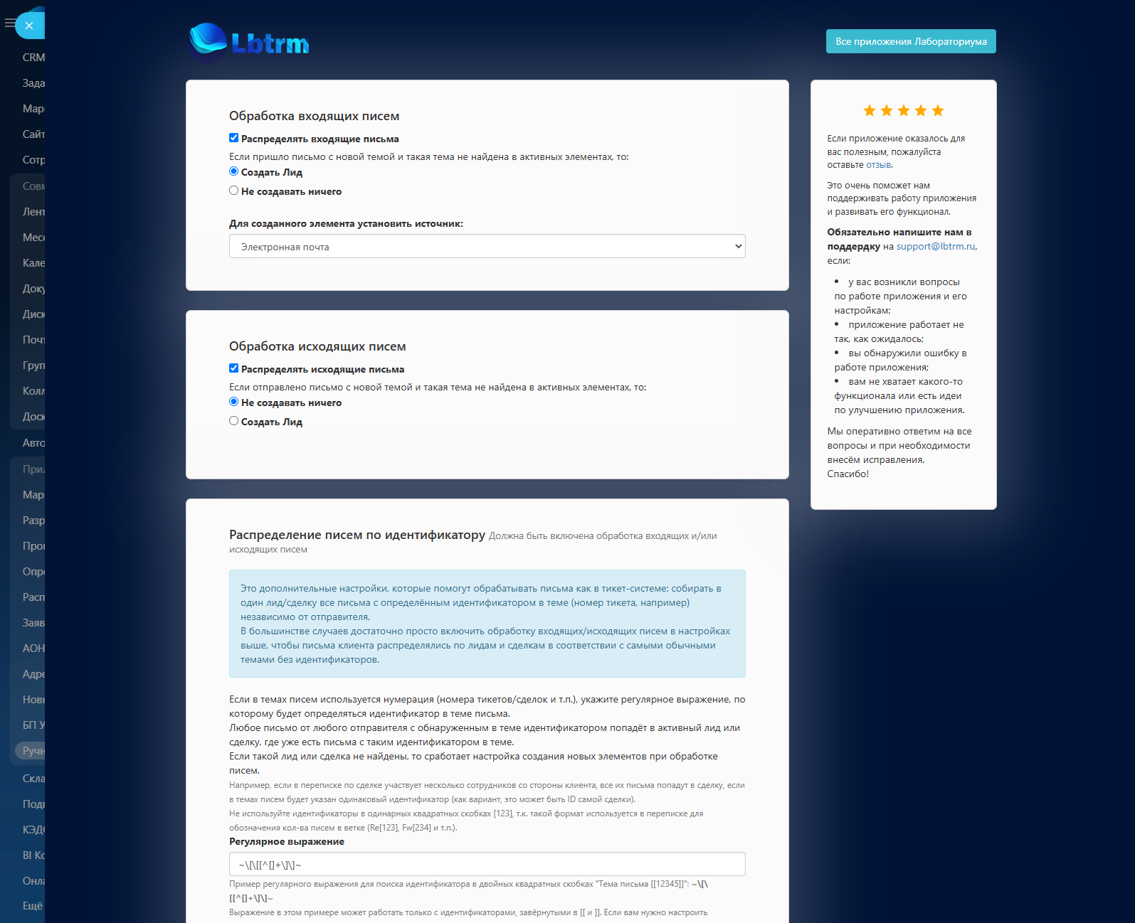 Автоматически распределяет письма по лидам и сделкам в зависимости от темы переписки. Может создавать лиды и сделки для новых тем. Умеет собирать в один лид/сделку переписку с разных адресов по ID заказа или тикета в теме письма.