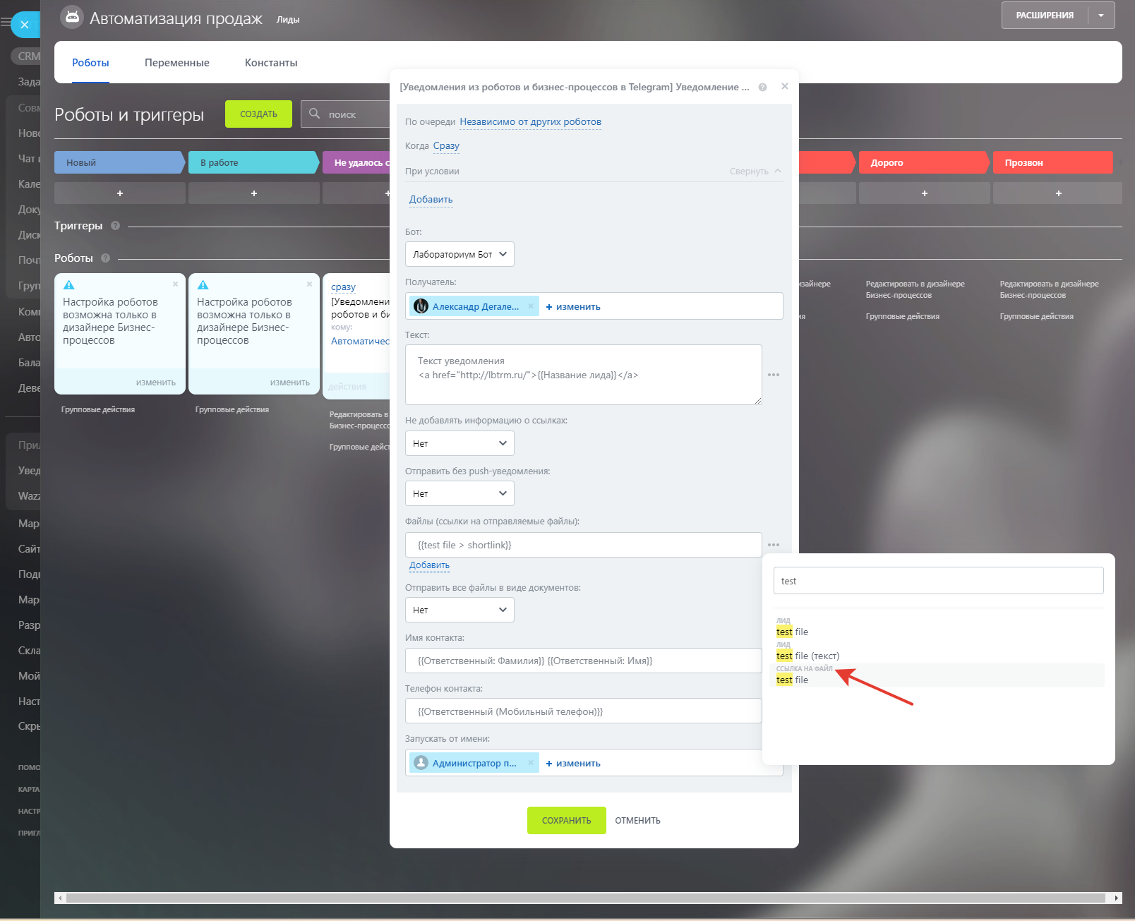 Обратите внимание!При удалении бота из настроек перестанут работать те роботы и активити, в настройках которых ранее был выбран удалённый бот.