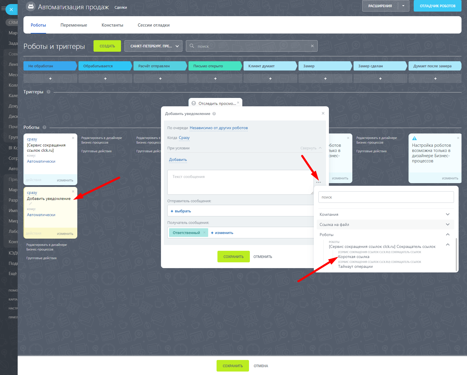 Добавьте робота, которому необходимо передать сокращённую ссылку.