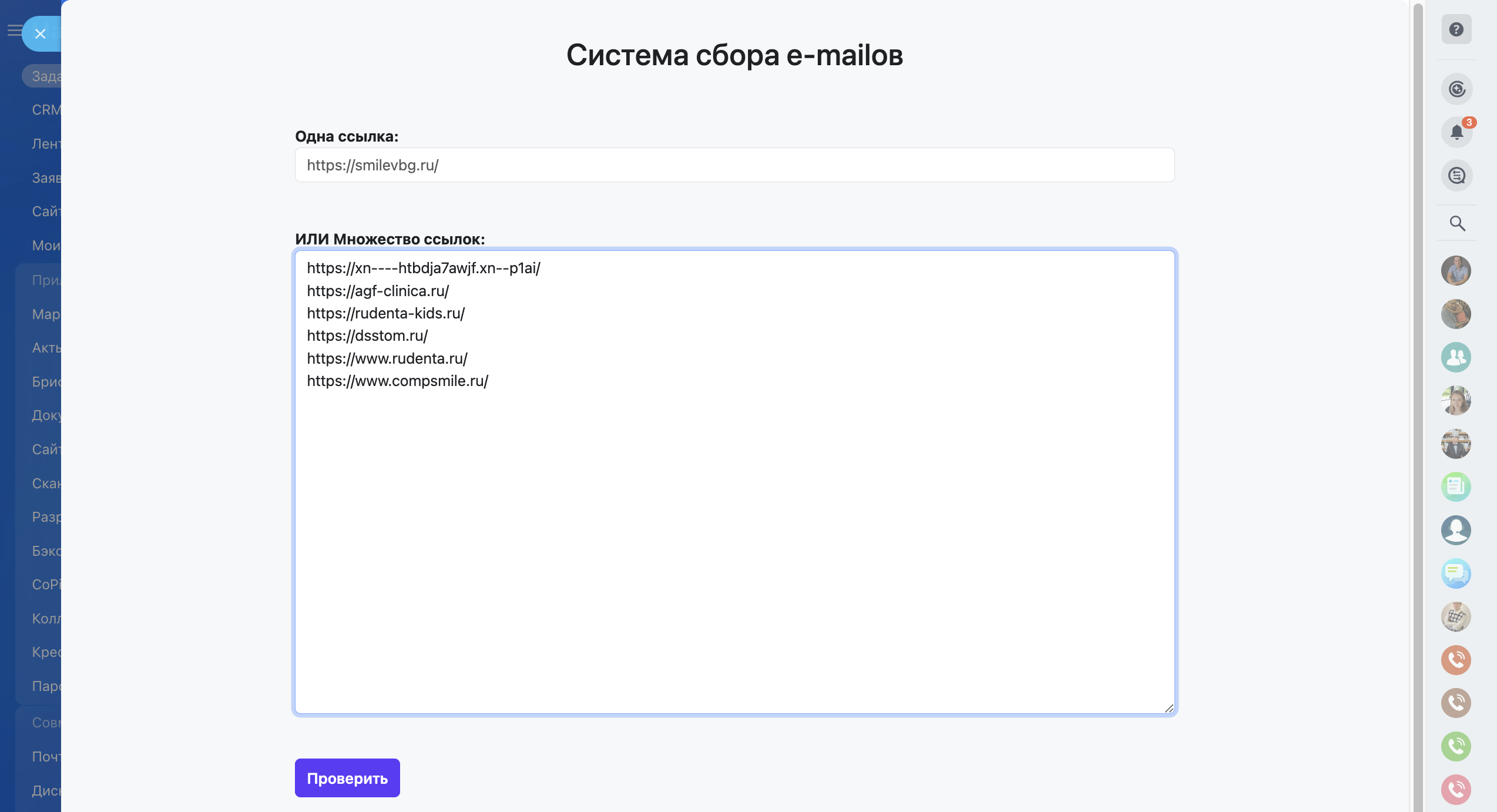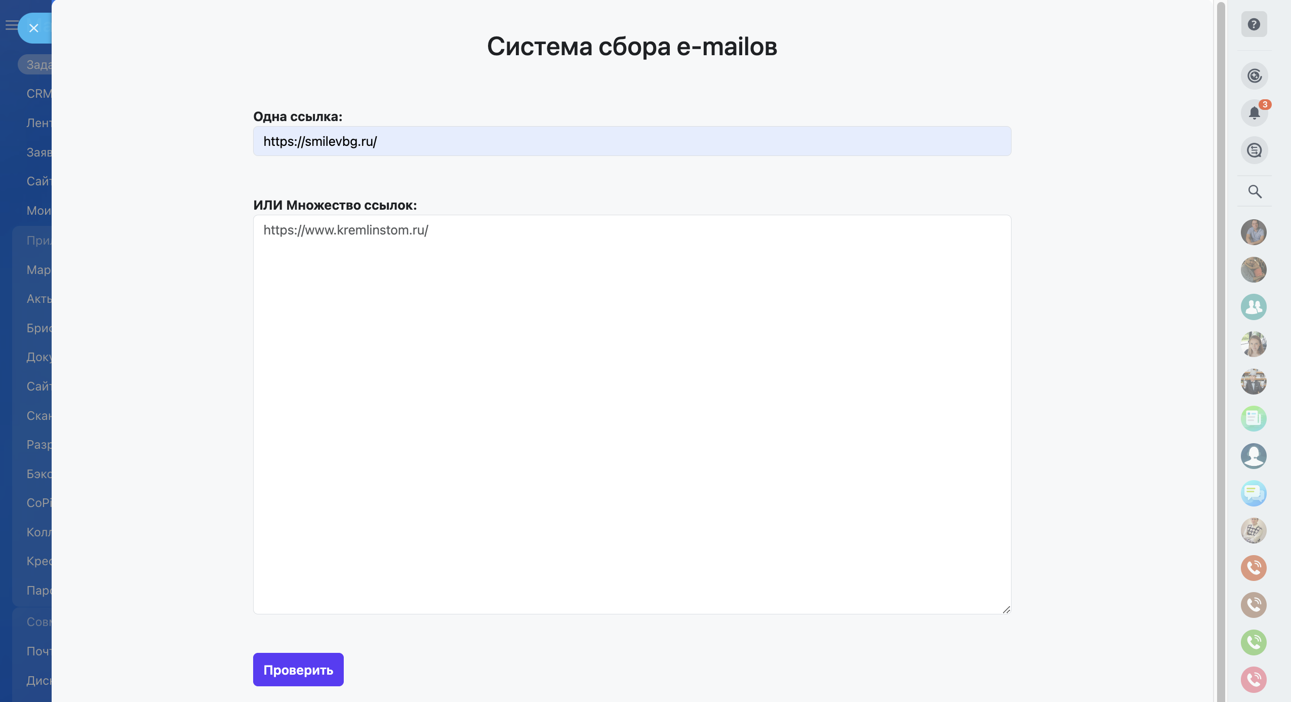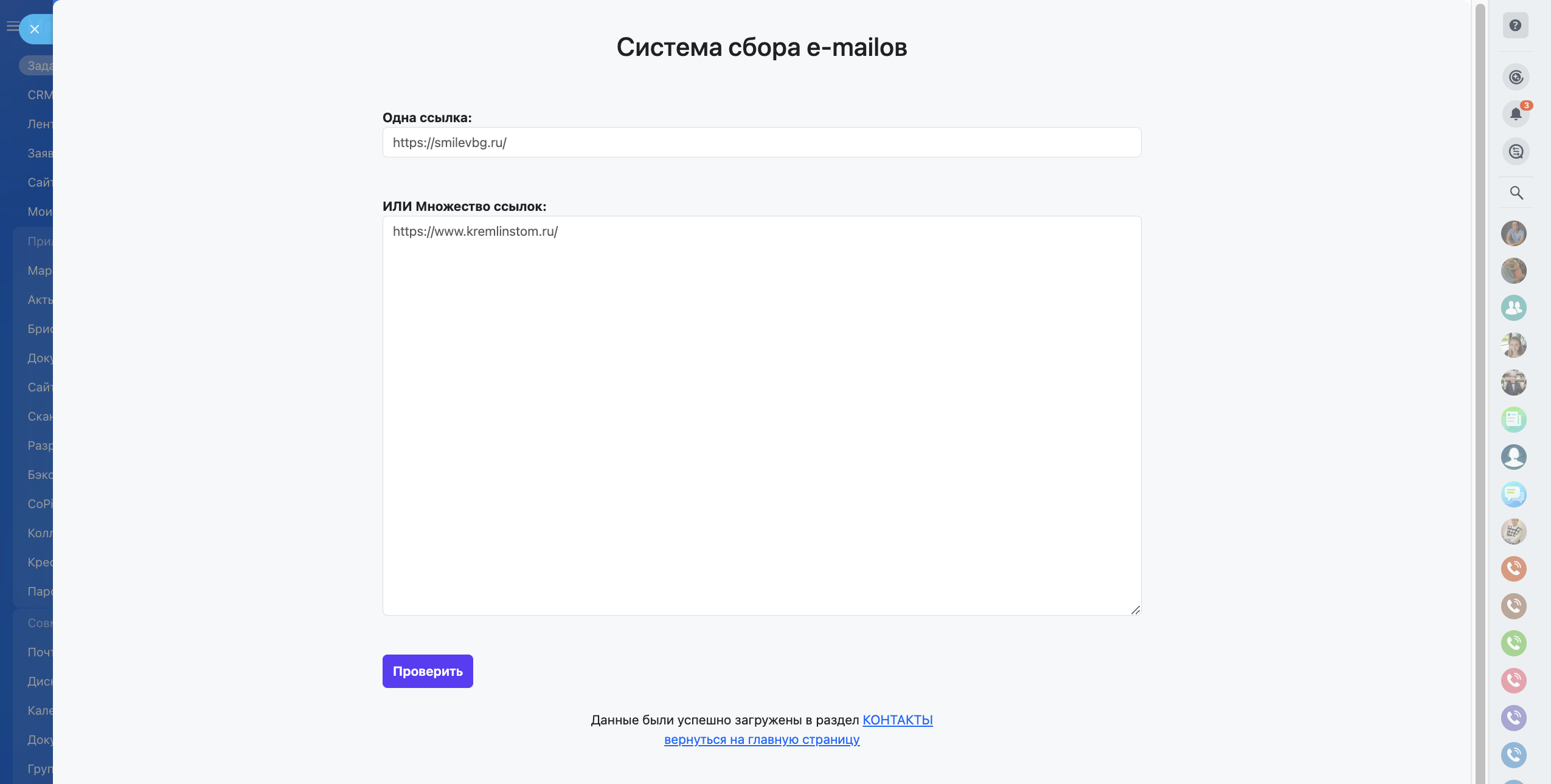 где есть такая версия и покажет есть ли на главной странице электронная почта и после всех этих манипуляций вы сможете контактные данные перенести к себе в раздел Контакты и уже делать рассылку и отправлять клиентам свои предложения.