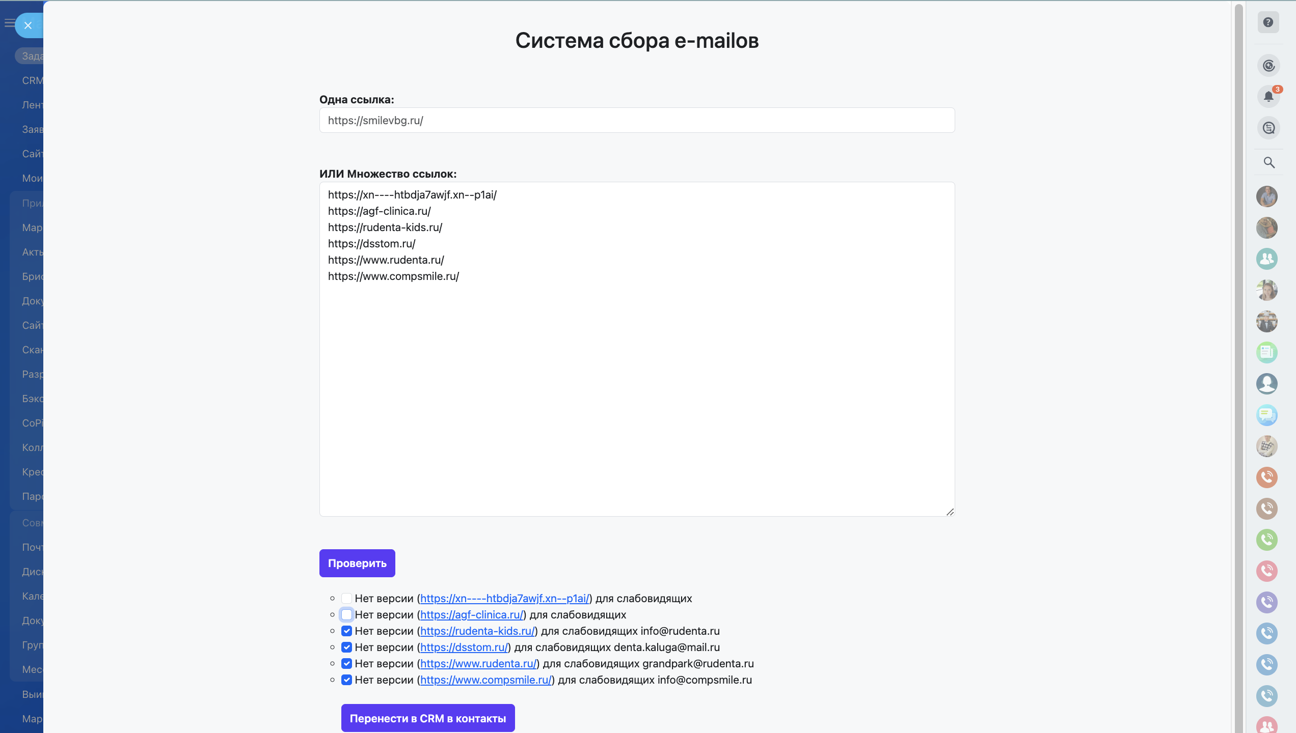Парсер e-mail с сайтов и проверка на присутствие версии для слабовидящих.