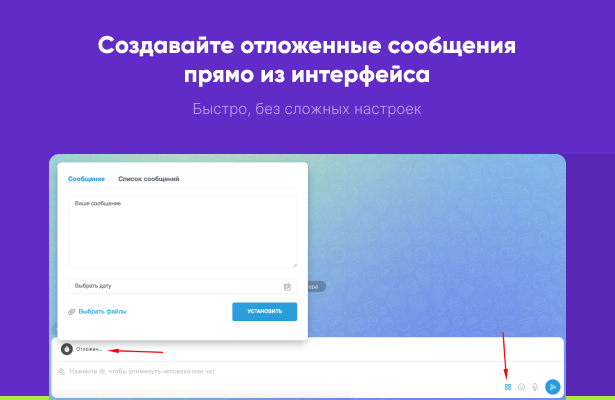 • Оптимизация взаимодействия с клиентами: Используйте функцию отложенных сообщений для организации последовательного общения с вашими клиентами. Например, если менеджеру через определенный период следует связаться с потенциальным заказчиком. Поставив сообщение в отложенные, такие важные моменты не пропускаются.