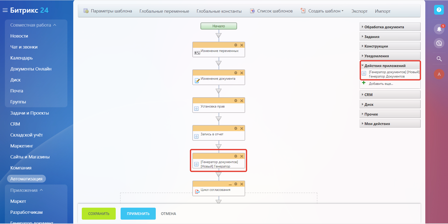 После загрузки шаблона можно начинать работу с документом в нужном Бизнес – процессе. Для этого подставляем приложение в нужную последовательность.