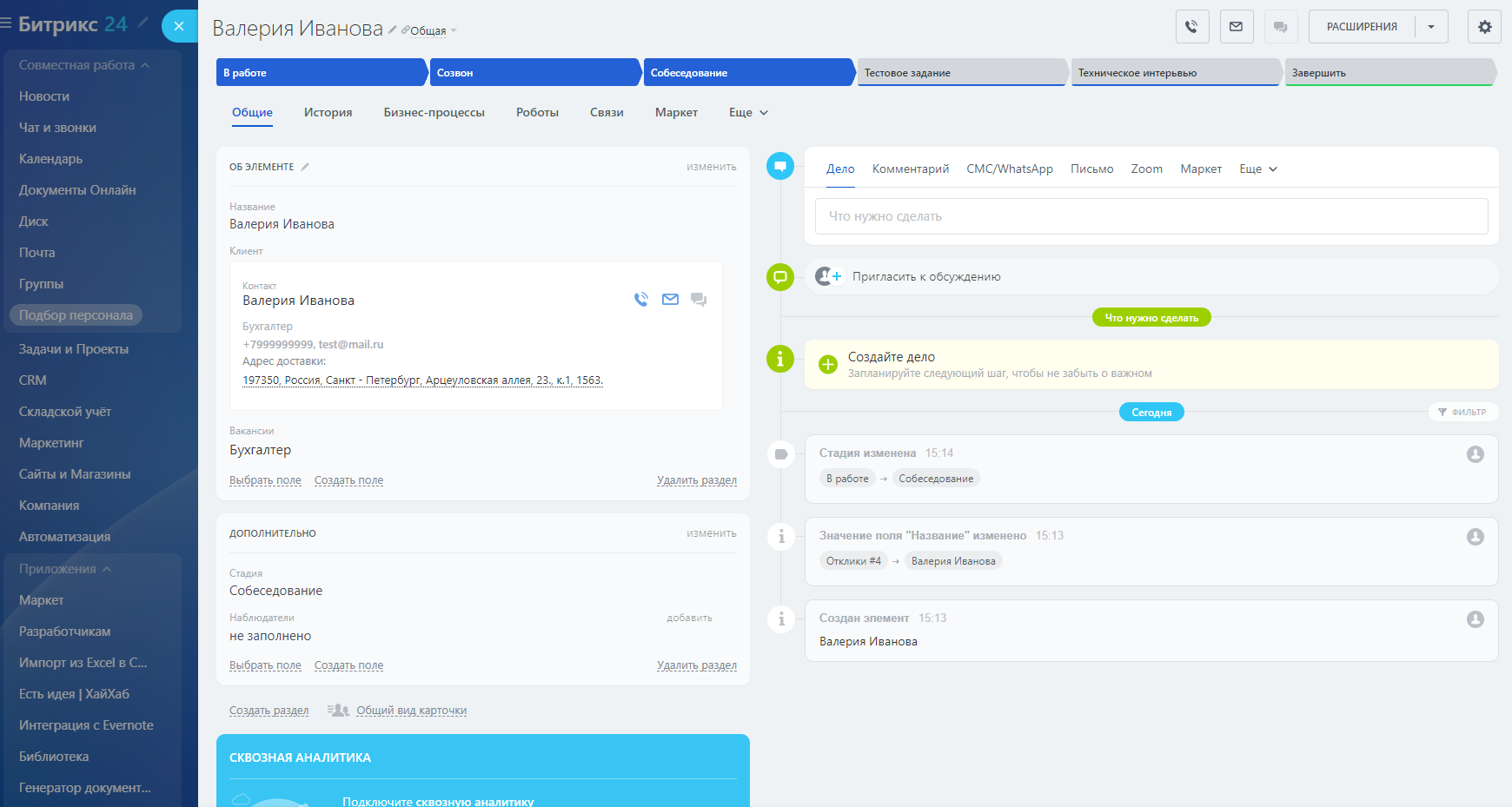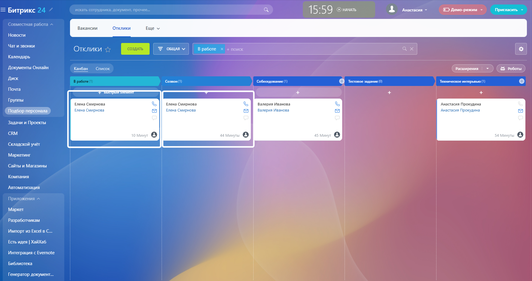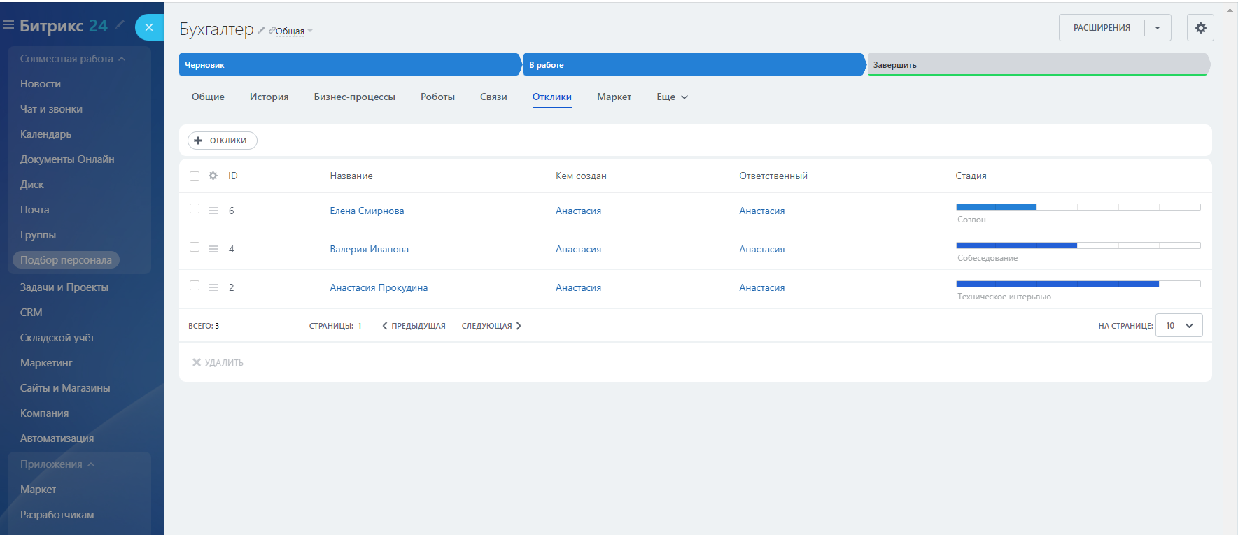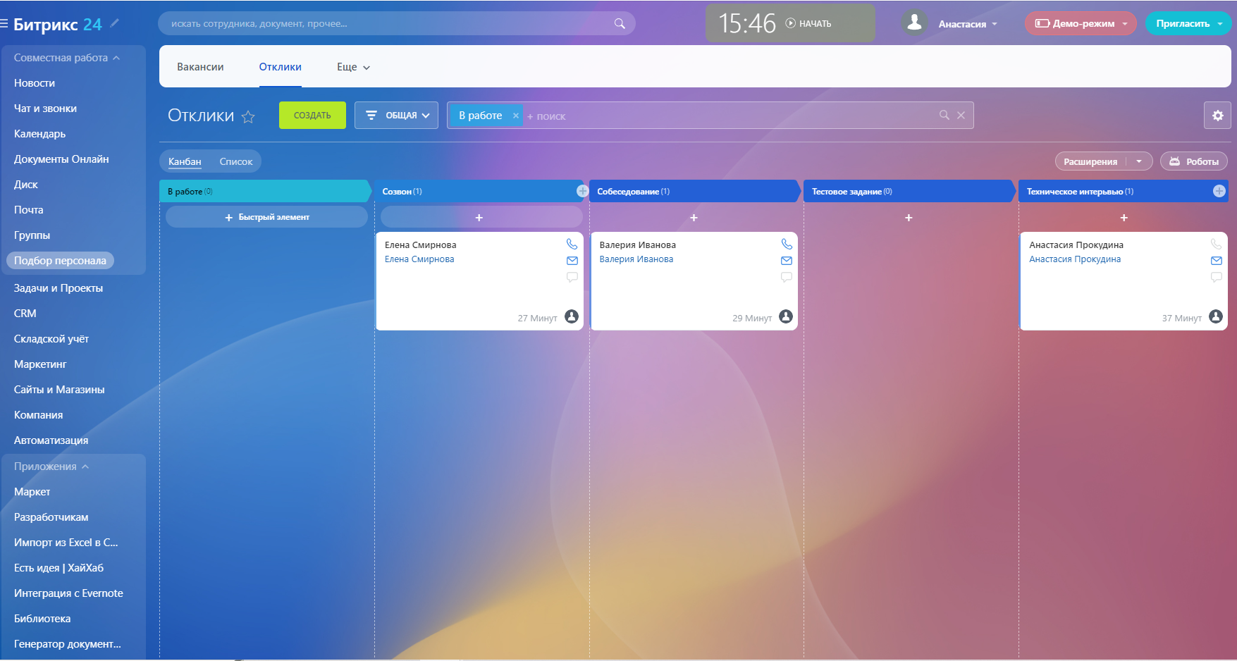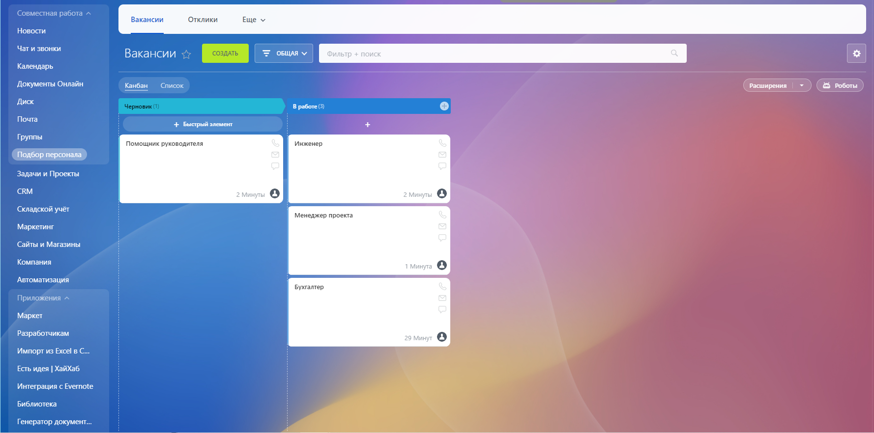 Сервис "Подбор персонала" от компании «Эм Си Арт» позволяет интегрировать работу по рекрутингу в систему Битрикс.24