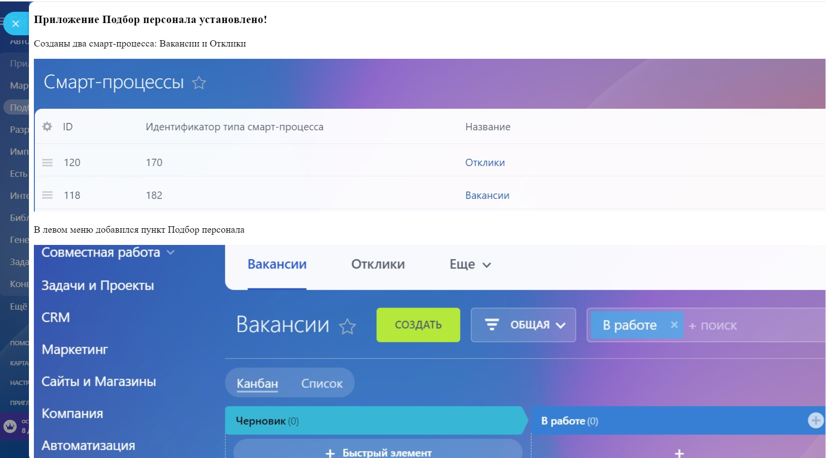 - Установите приложение из Битрикс24.Маркет. После установки приложения появится информация о том, что оно успешно установлено, а в левом меню отобразится отдельный раздел “Подбор персонала”.