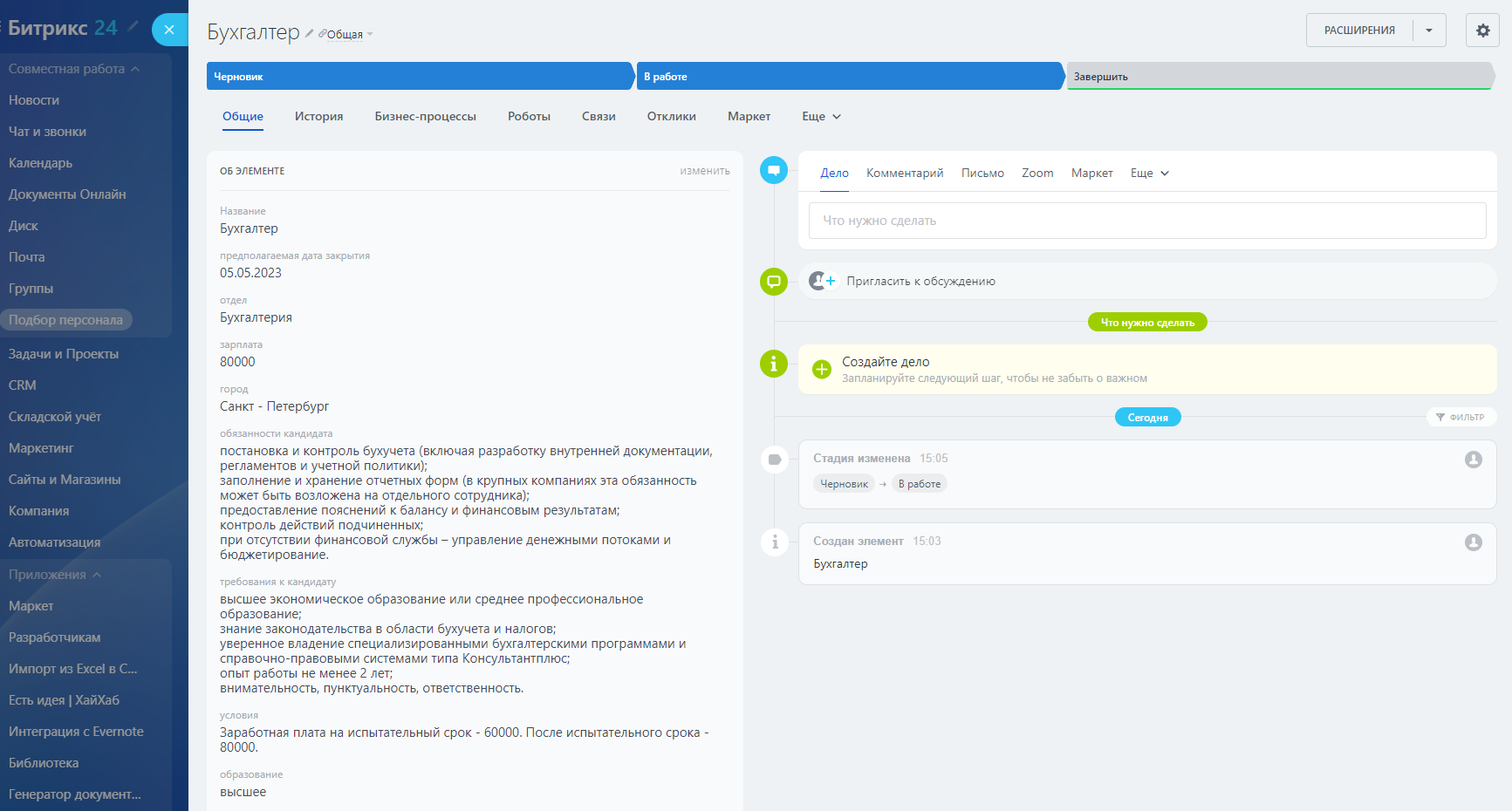 - Работа с приложением осуществляется в рамках 2 сущностей на смарт-процессах: Вакансии и Отклики.