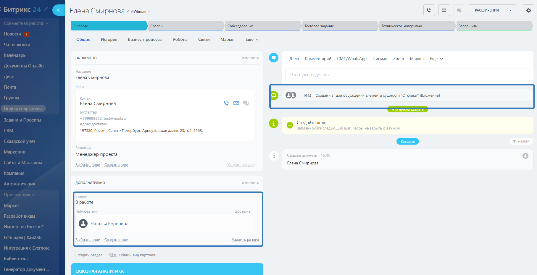 - Всю коммуникацию можно вести в рамках Вакансии и Отклика соответственно, добавив наблюдателей.